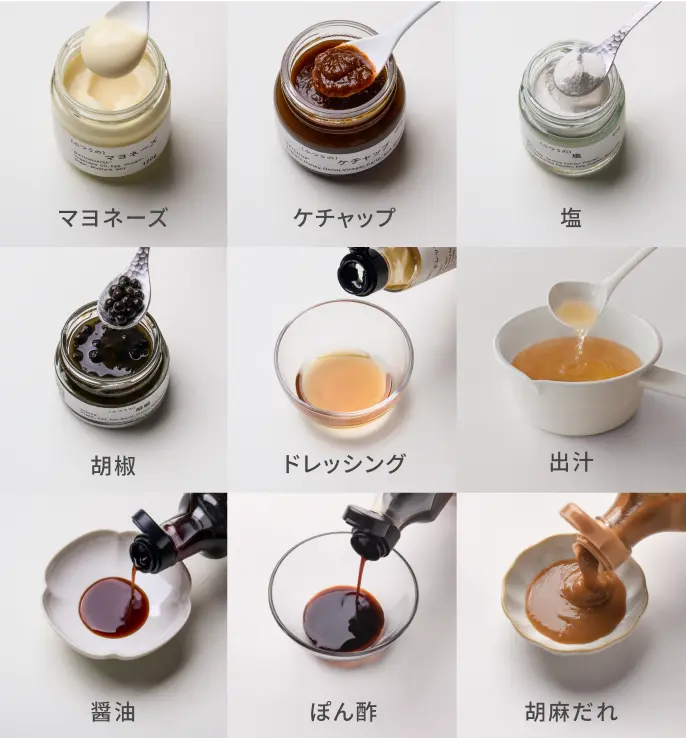 2回目以降は、3瓶セットの組み合わせをマヨネーズ、ケチャップ、塩、胡椒、出汁、ドレッシング、醤油、ぽん酢、胡麻だれの中からマイページで自由に変更いただけます。