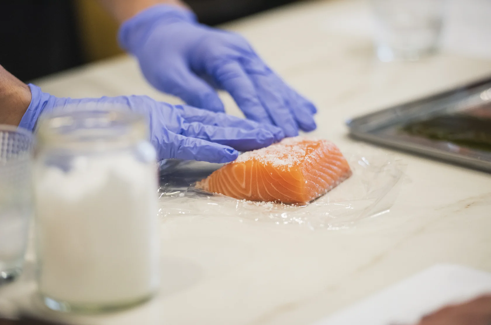 まずは「サーモンの昆布締め」の仕込みから。サーモンに塩をまぶして、15分置き、水分を抜いていきます。
