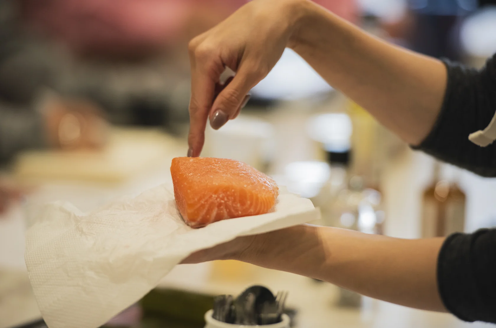 水分が出てきたら、表面をさっと拭き、昆布でぴったり包んでいきます。昆布は、日本酒を染み込ませたキッチンペーパーで拭いてあげるのがポイント。やわらかくなって、サーモンにきっちり沿って包むことができます。