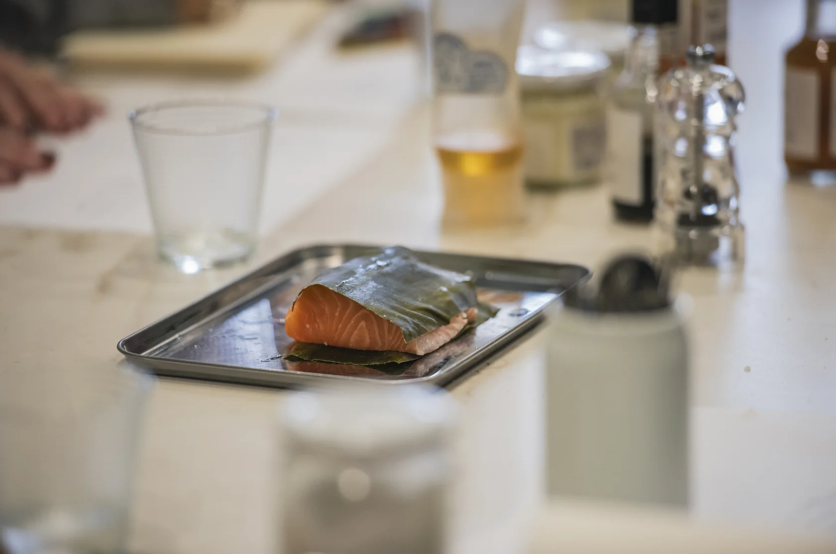 白身魚は塩をよく吸うので、サーモンよりは抑えめの量にする必要があるそうです。ただ、今回は昆布締めなので、サーモンには重量の1.2%の塩を、白身魚だったら1%の塩を勧める青谷さん。