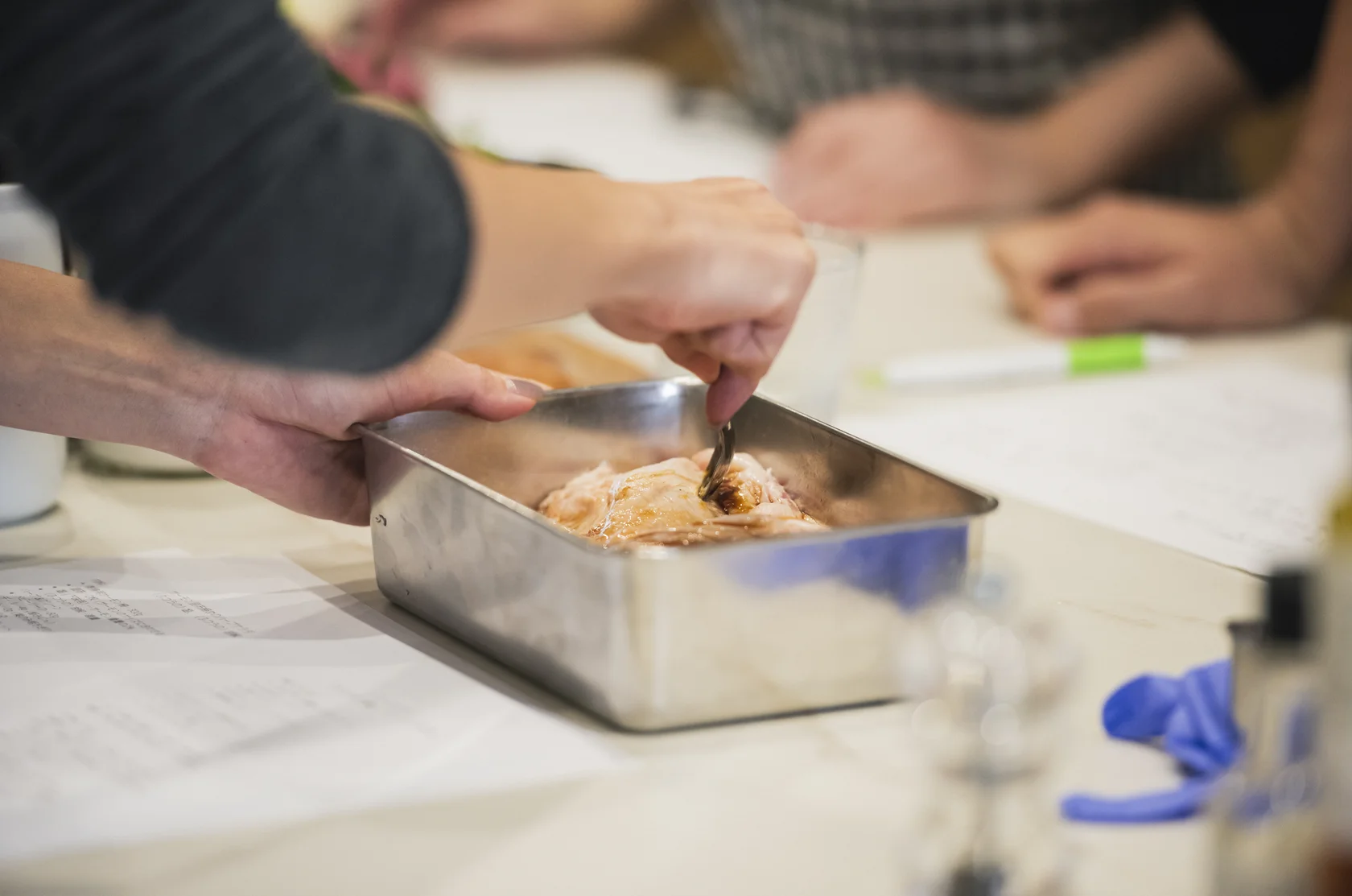 「下味で塩を入れていくときは、重量の1%が適量です」と話す青谷さんに、すかさず「サーモンではなく、白身魚の場合でも同じですか?」と質問が飛びます。