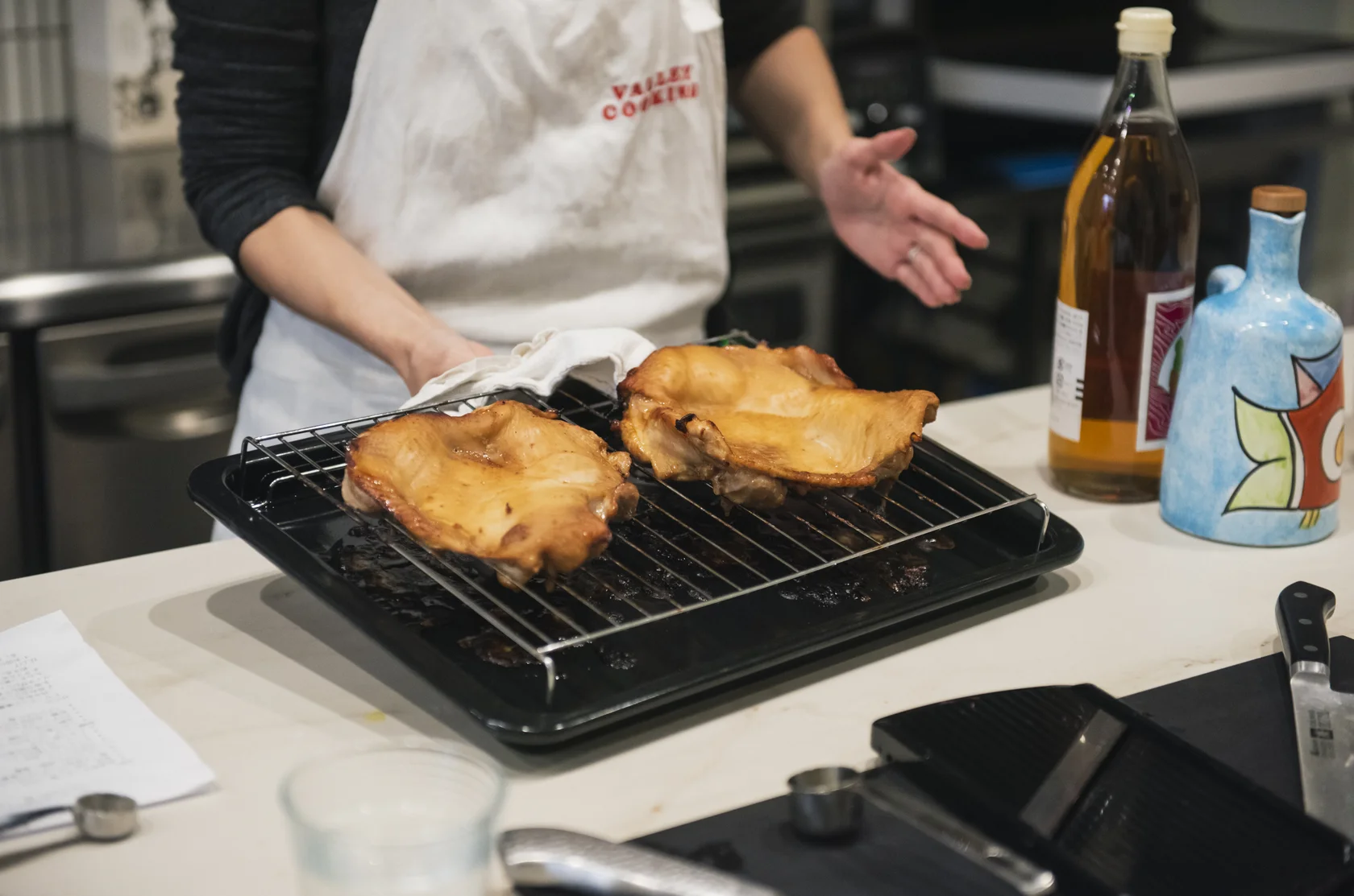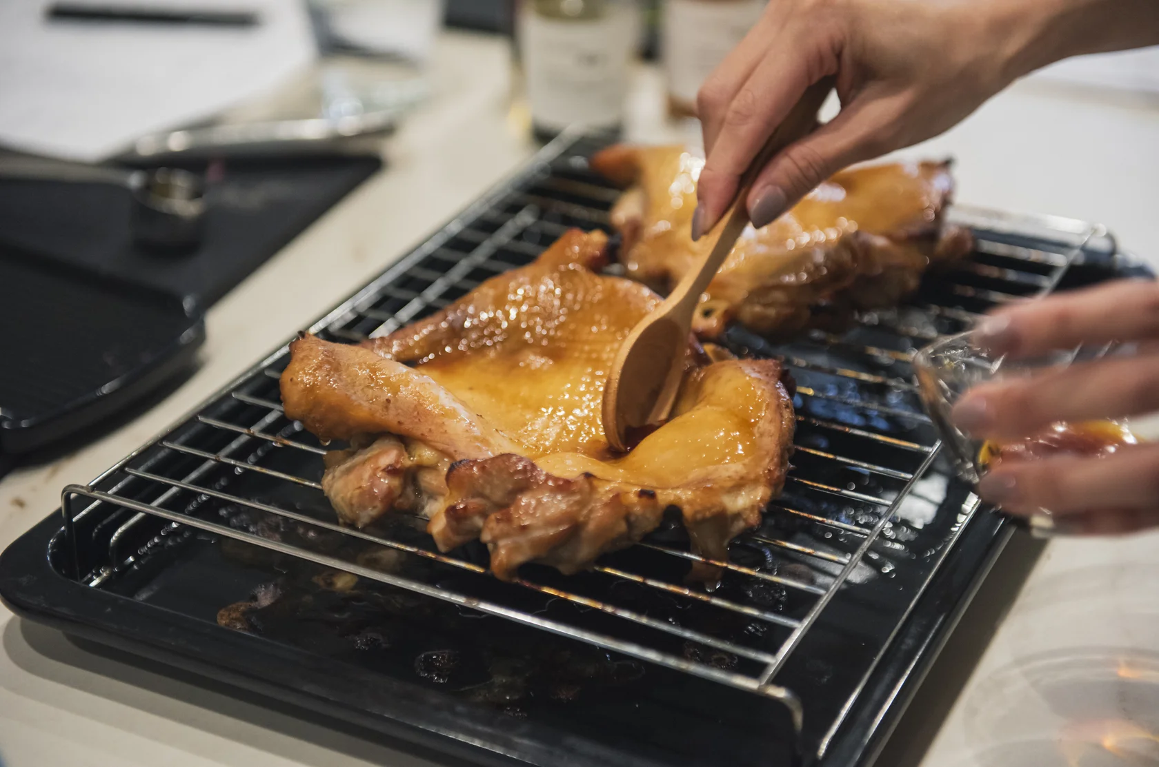 そして、レッスンもいよいよ終盤。ローストチキンは、180℃の予熱のあと、段階を分けて温度を上げつつ、焼き上げていきます。温度を上げるたびに取り出し、仕上げ用のグレーズ(照り焼き)を重ね塗りしていくのがポイントです。