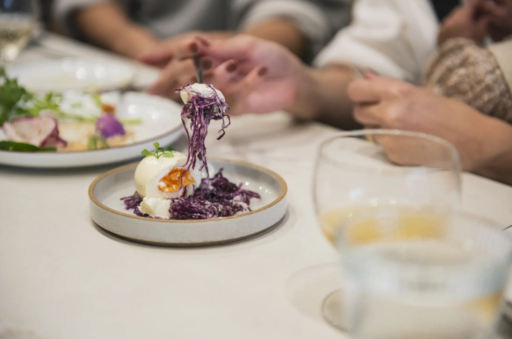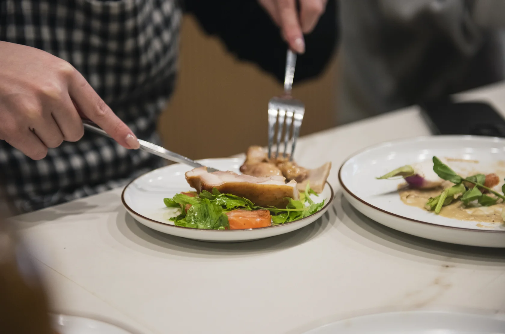 4品が揃うと、テーブルは一気に華やいだ空気に。フォークとナイフを手に取り、思い思いの料理に手を伸ばす参加者の方たち。