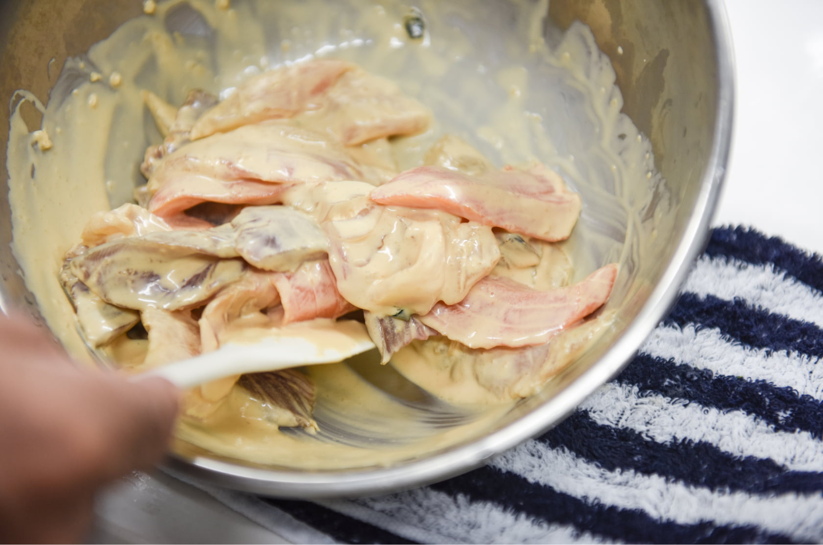 漬けダレを作るときは、醤油からではなく「(ふつうの)マヨネーズ」から先に入れるのがコツ。液体の中に、それよりも粘度の高いものを入れるとダマになりやすいです。先に粘度の高い「(ふつうの)マヨネーズ」を入れて、そのあとに醤油などの水分で伸ばしていくとなめらかに混ざります。