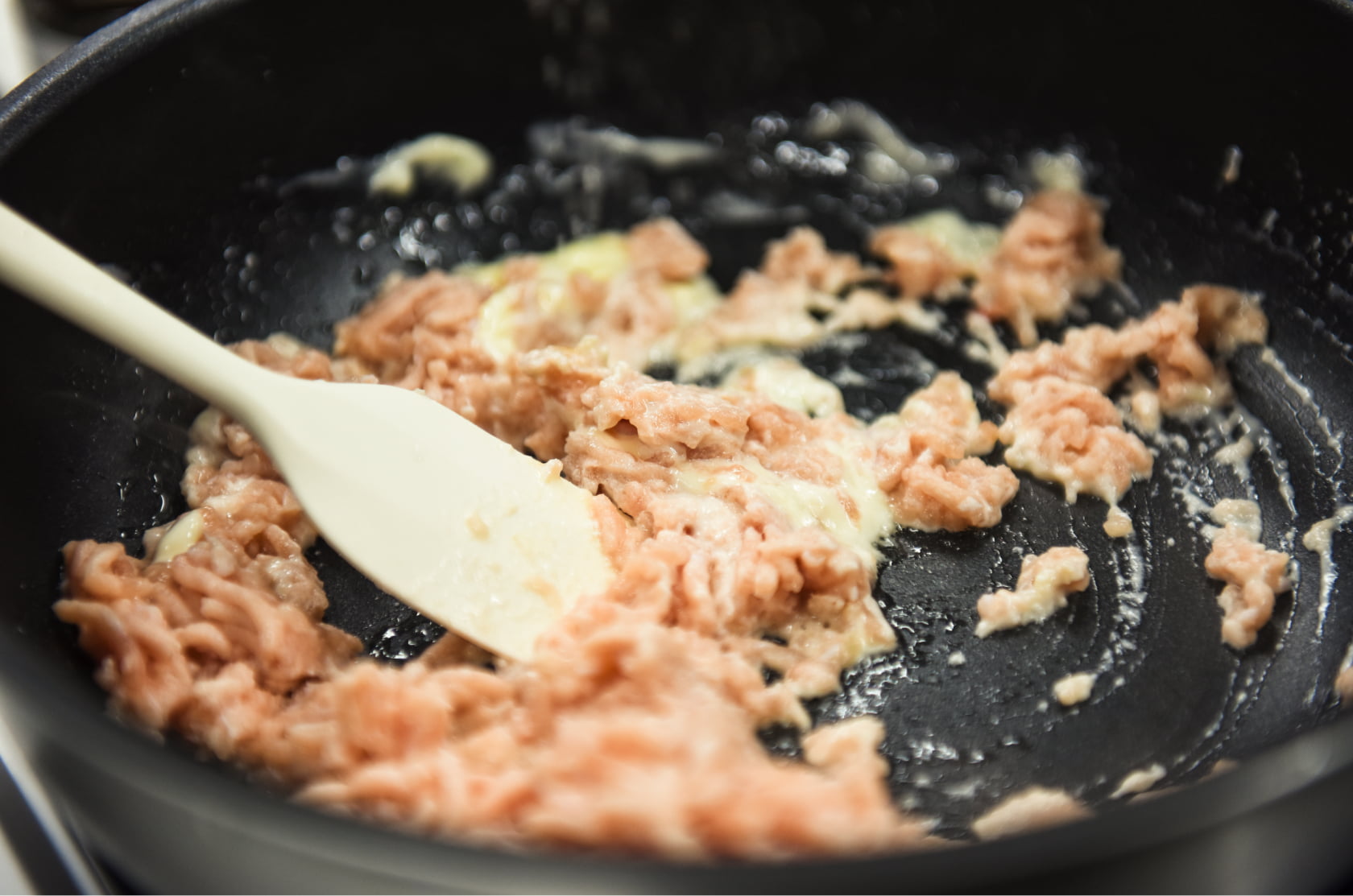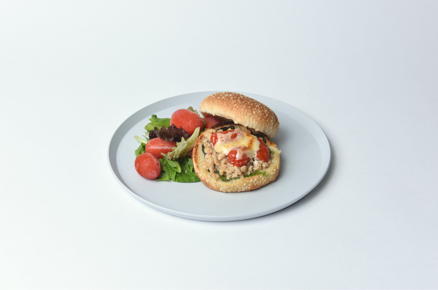 基本の使い方に慣れたら、次は炒め油としての活用も。「(ふつうの)マヨネーズ」で炒めた鶏そぼろにトマトを重ねて焼くと、ボリューム満点のハンバーガーの完成です。