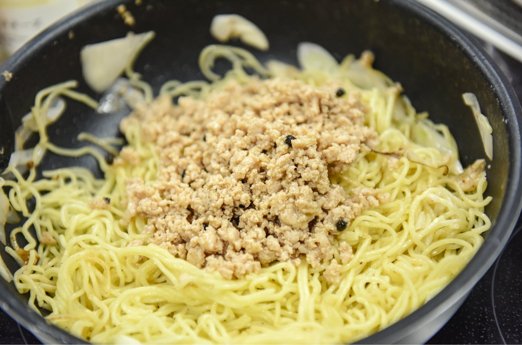 「トマトマヨバーガー」で使用した鶏そぼろは、そのまま別の料理にもアレンジ可能。鶏そぼろに、「(ふつうの)マヨネーズ」で炒めた具材と麺を絡めれば、鶏肉の旨みが活きた焼きそばに。
