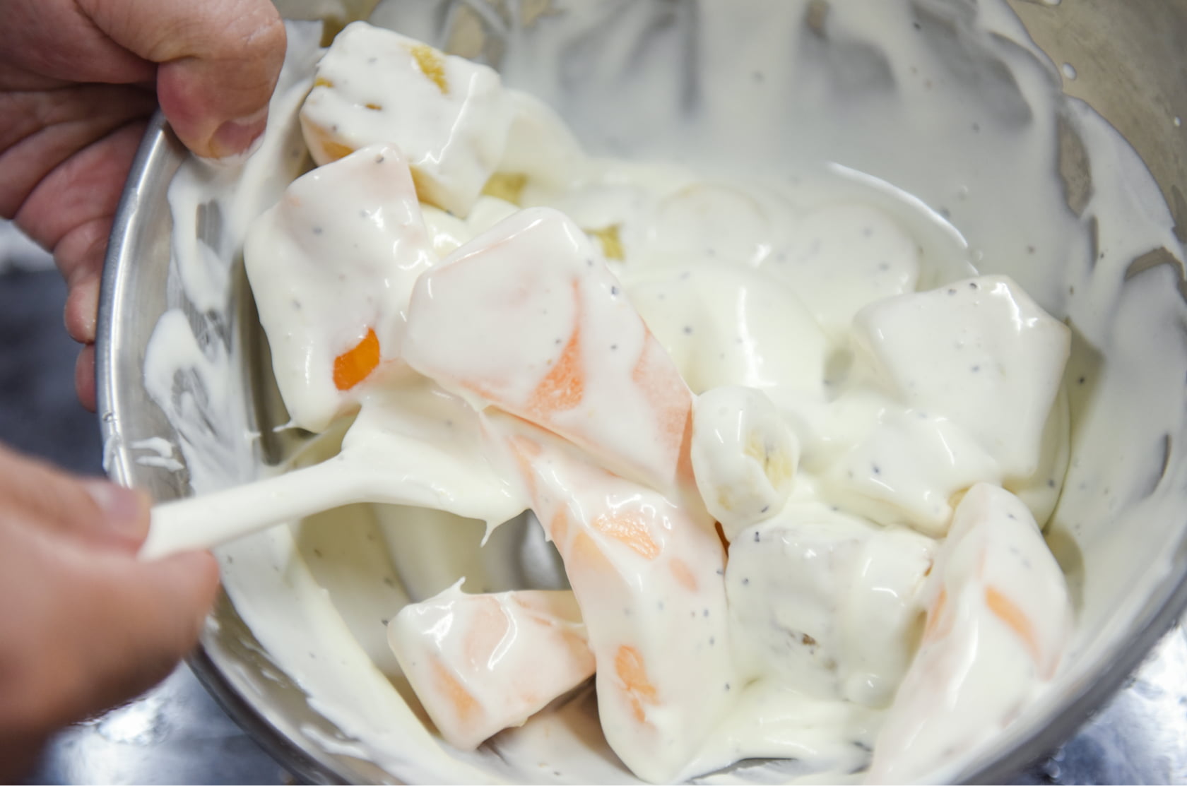 最後は「(ふつうの)マヨネーズ」と生クリームを合わせるという新発想。フルーツ盛りにぴったりなデザートソースを作ることができます。
