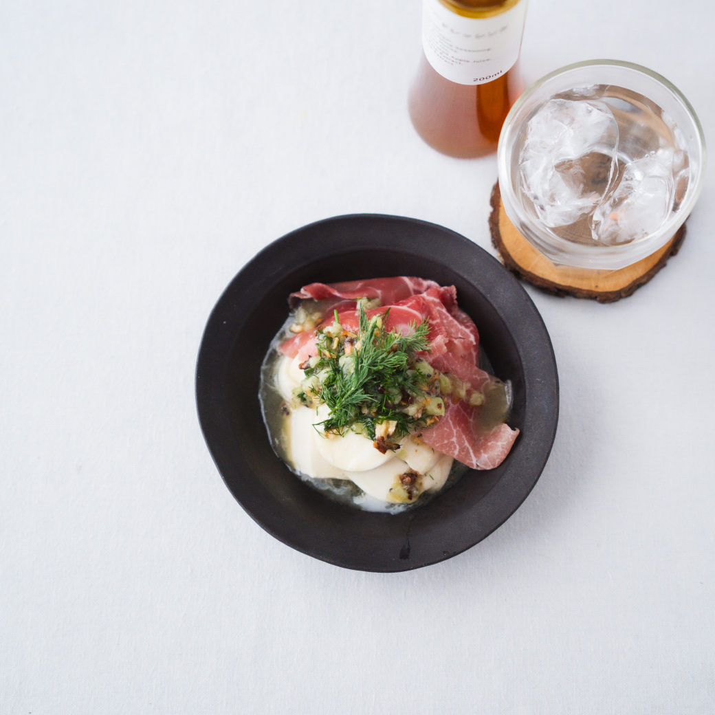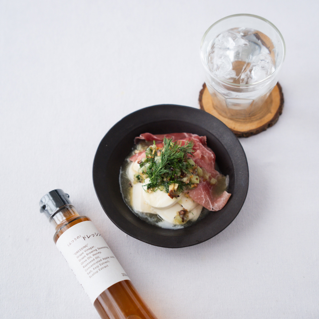 酸味がまろやかなぶどう酢、白ワインを煮ることでワインの風味を立たせ、ホタテエキスや昆布エキスを加えることでコクとうま味、さらにりんご果汁で甘みが立つように調合。 甘味、酸味、塩味、うま味、全てが調和する1つの味を立たせない味わいと、さらりとしたオイルのようななめらかさが特徴です。