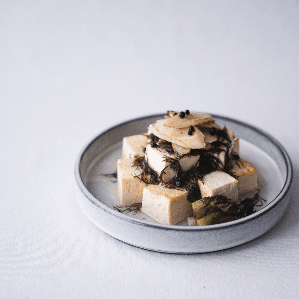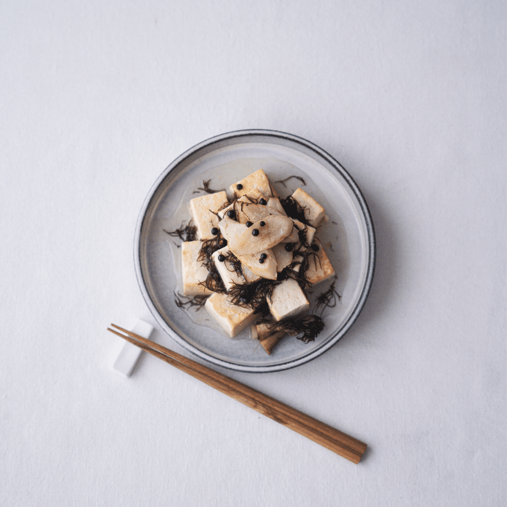 - 木綿豆腐を皿に盛り付け②のあんをかけてうどをのせ、(ふつうの)胡椒をかけて出来上がり。
