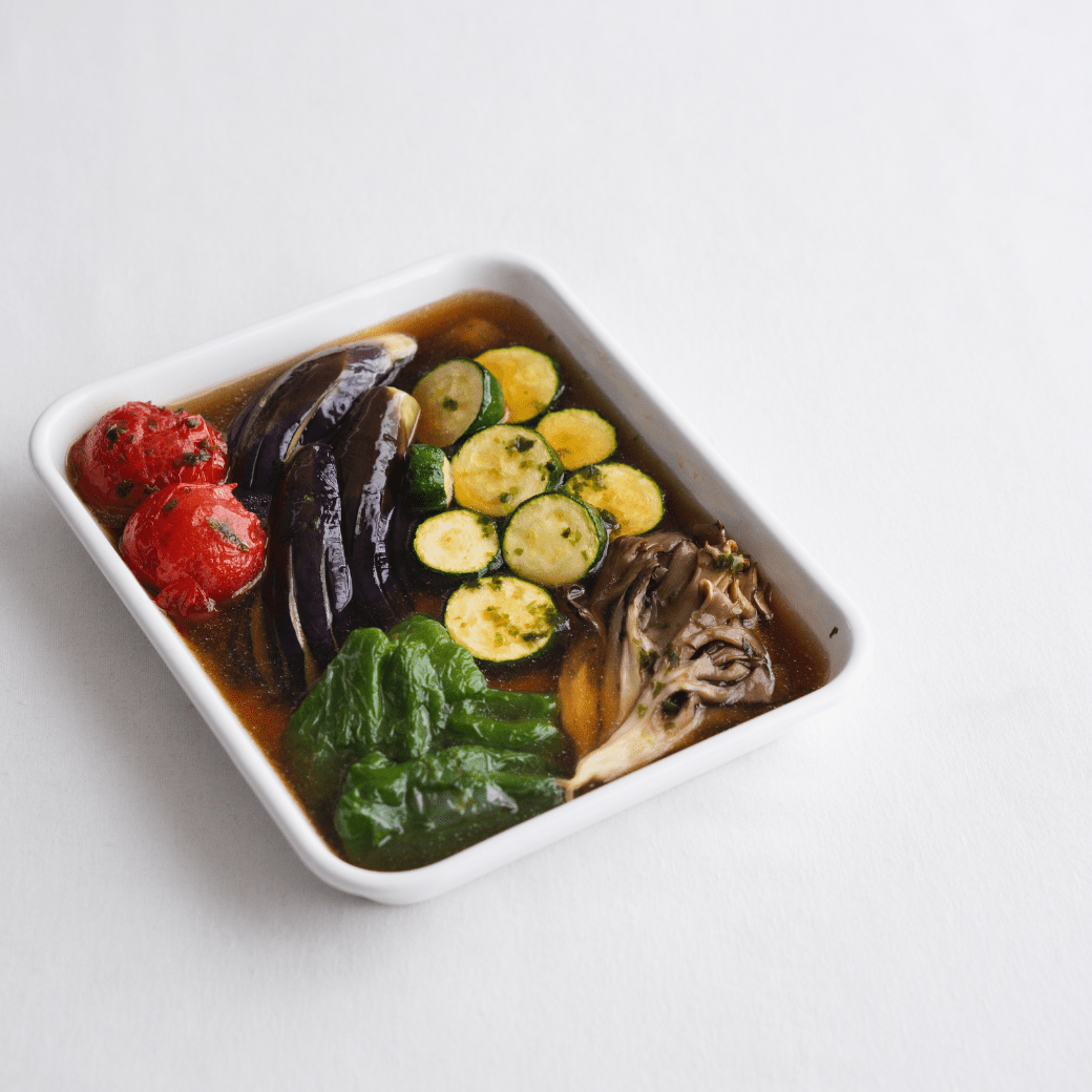 - なすは半分に切り、先に切り込みを入れ、水に浸してあく抜きをしておく。ピーマンは半分に切り、種を取る。ズッキーニは2㎝幅の輪切りにし、舞茸は食べやすく分ける。トマトはヘタを取り、皮に2本ほど切り込みを入れておく。