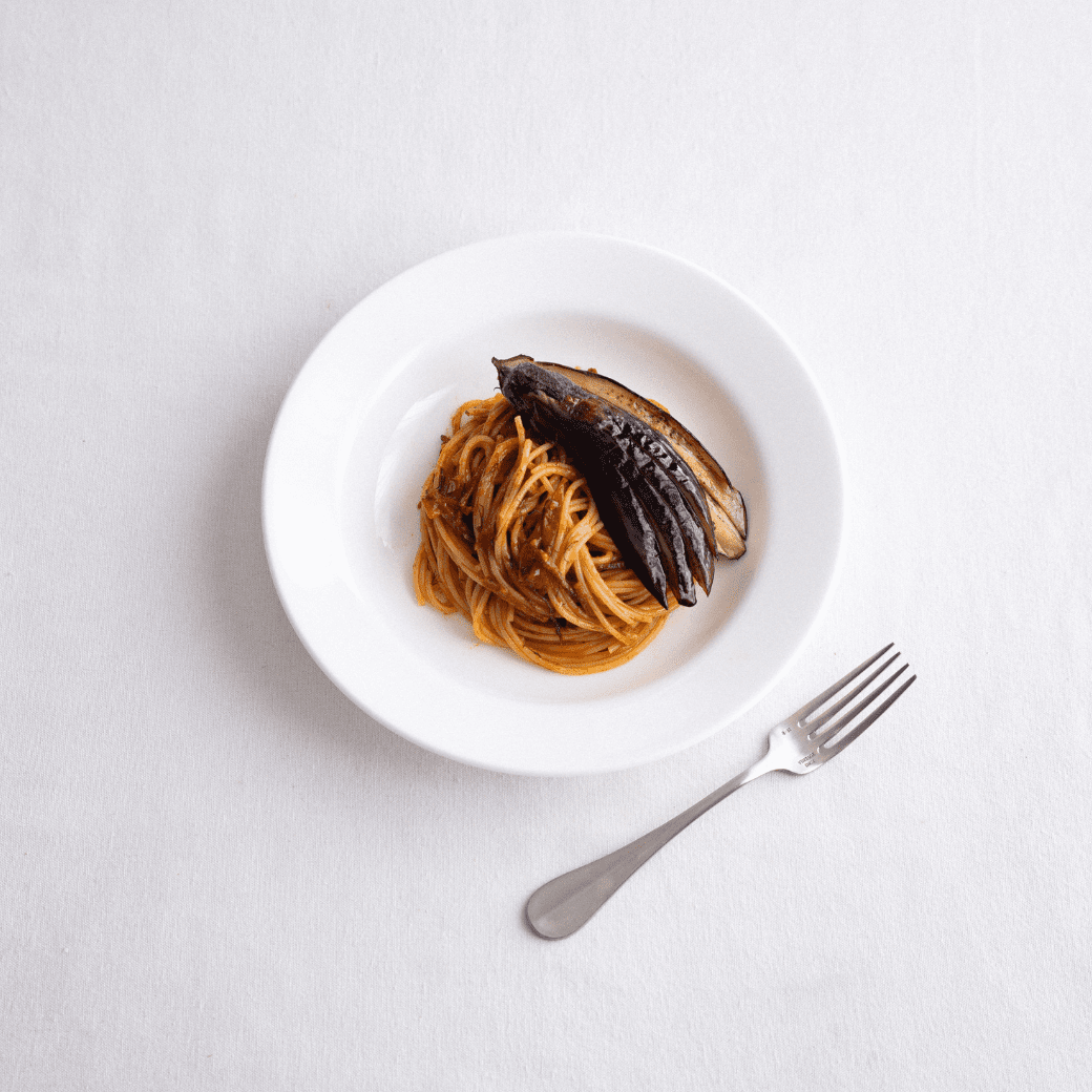 - スパゲッティ茹でて、茹で上がったら③にからめる。皿に盛り付け、なすをのせて出来上がり。