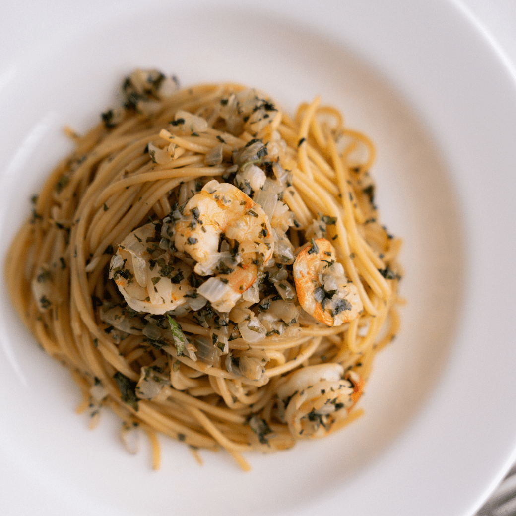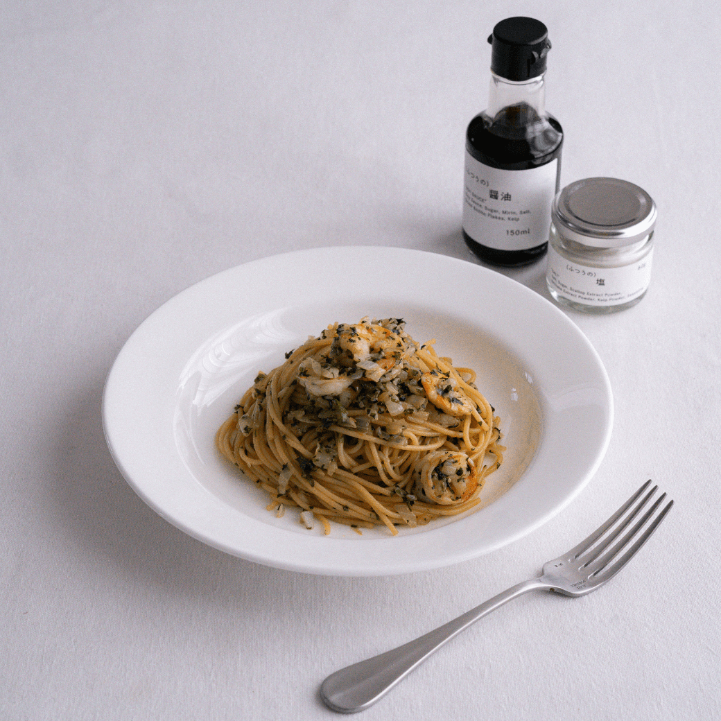 - フライパンに油を回し入れ、(ふつうの)塩、玉ねぎを入れて火にかける。しんなりとしてきたらえびを入れて火を通す。さらに大葉を加えてサッと全体に炒め合わせたら②と(ふつうの)醤油を加えてからめる。お好み量のわさびを加えて皿に盛り付けて出来上がり。