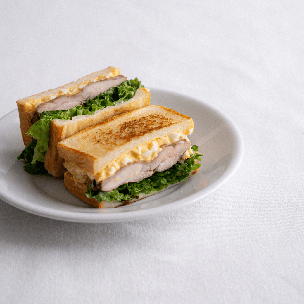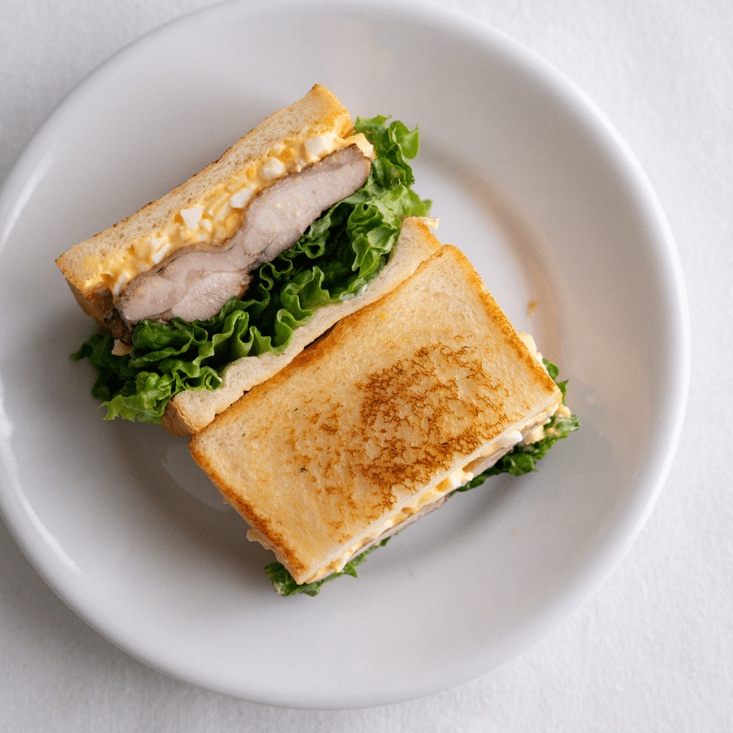 - パンの内側にバターを塗り、リーフレタス、③の鶏肉、②の卵をのせてサンドする。半分にカットしていただく。