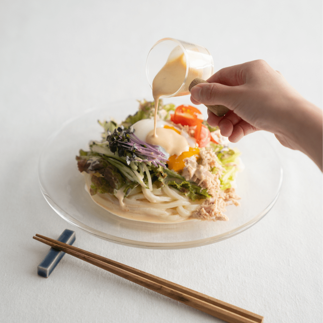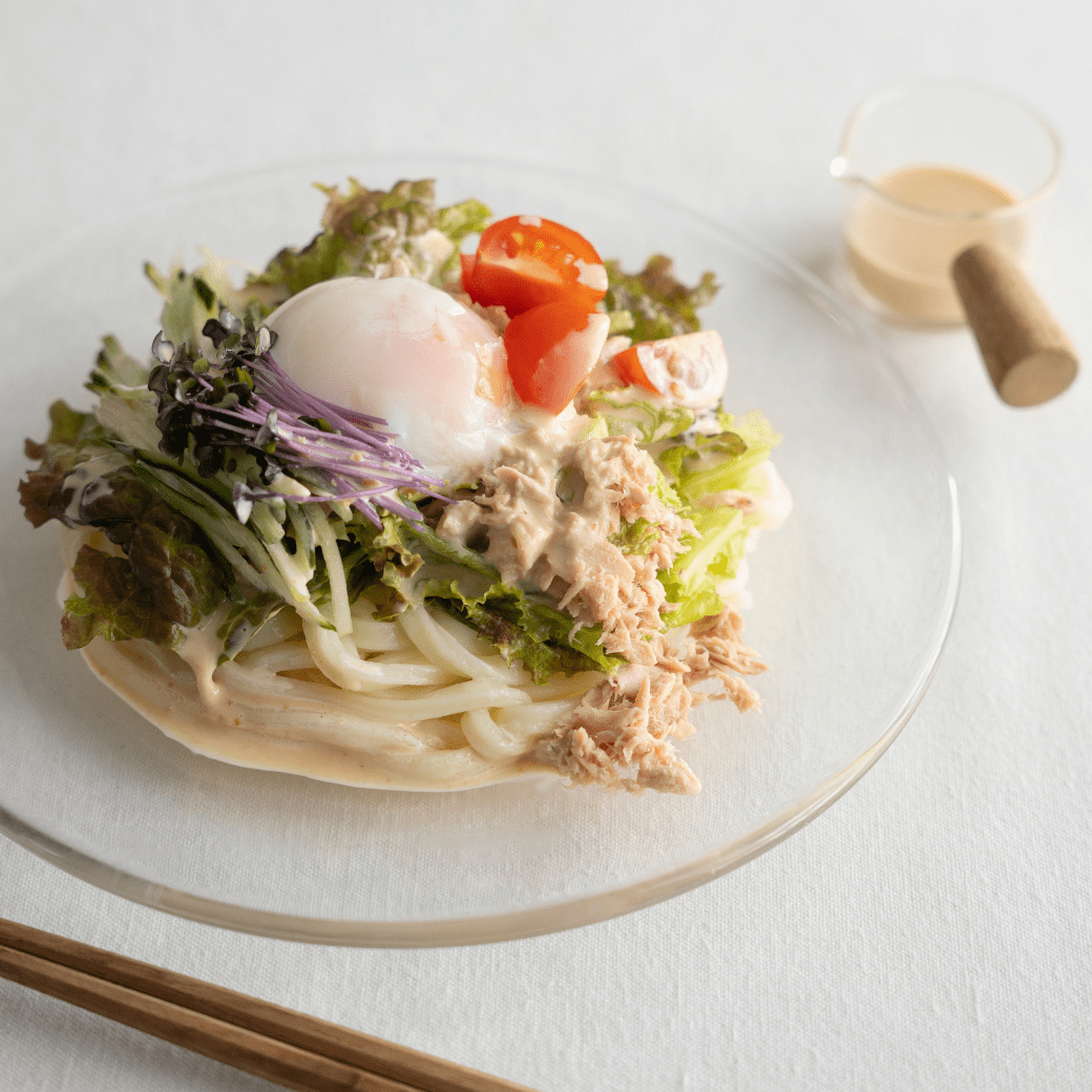 - お皿にうどんを盛り、リーフレタス、きゅうり、ツナ、トマト、スプラウトを盛り付ける。温泉卵をのせる。①のつゆをかけていただく。
