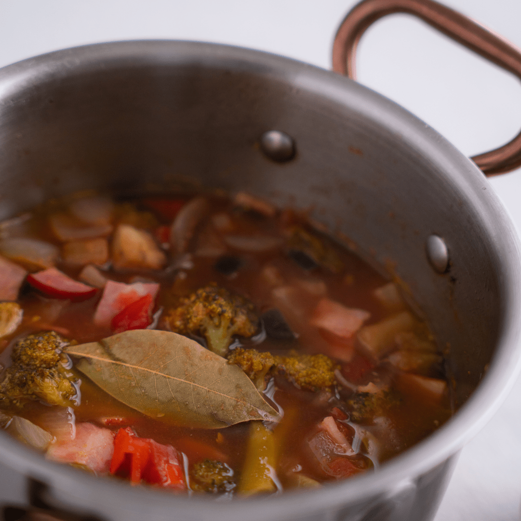 - ブロッコリーは小房に分け、茎の部分は1cm角に切る。茄子は2cm角に切り、水にさらしてアクを抜く。セロリは筋を取り、2cm角に切る。玉ねぎ、トマト、ベーコンもそれぞれ2cm角に切る。