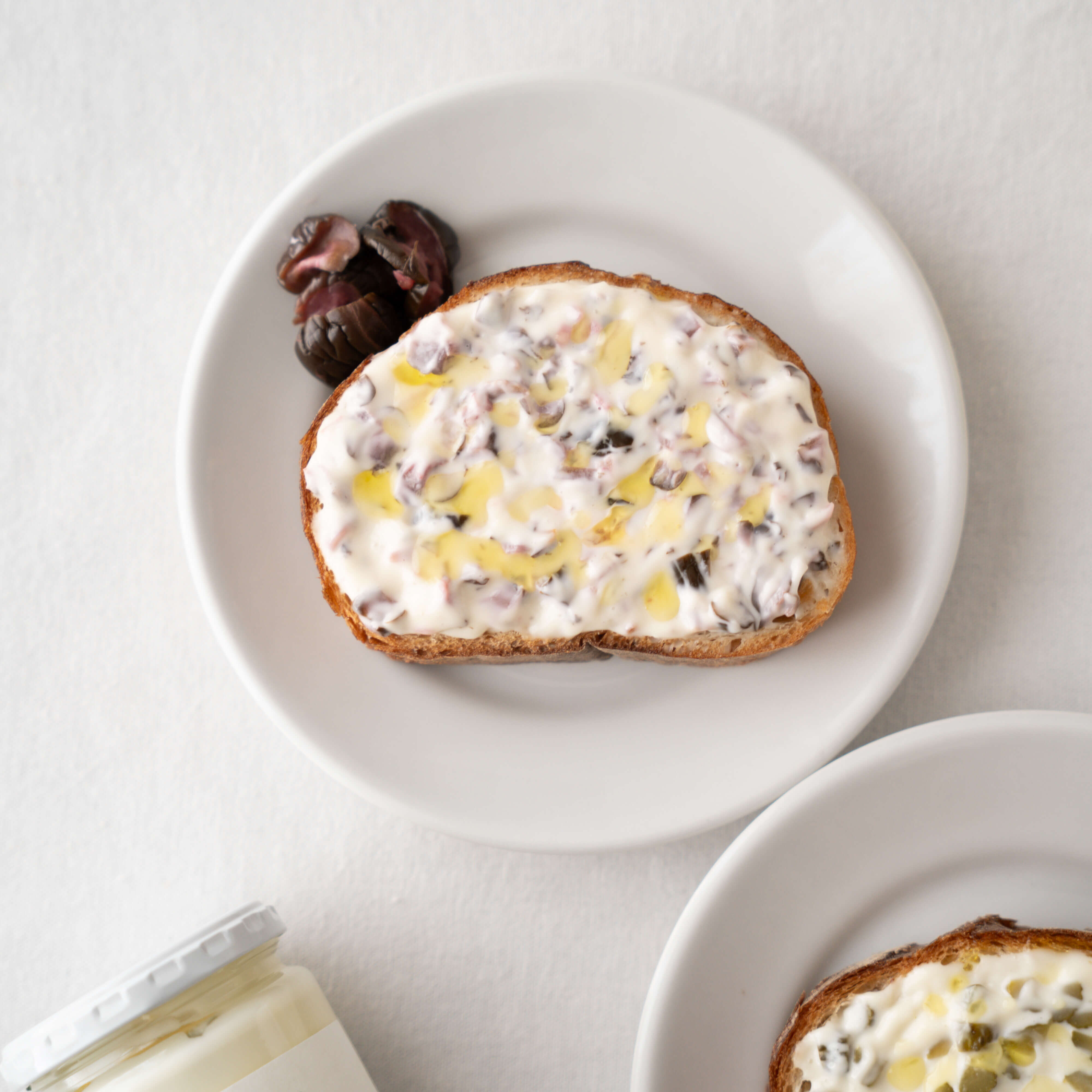 - パンを軽くトーストし、①のソースを塗り、仕上げにオリーブオイルをかける。