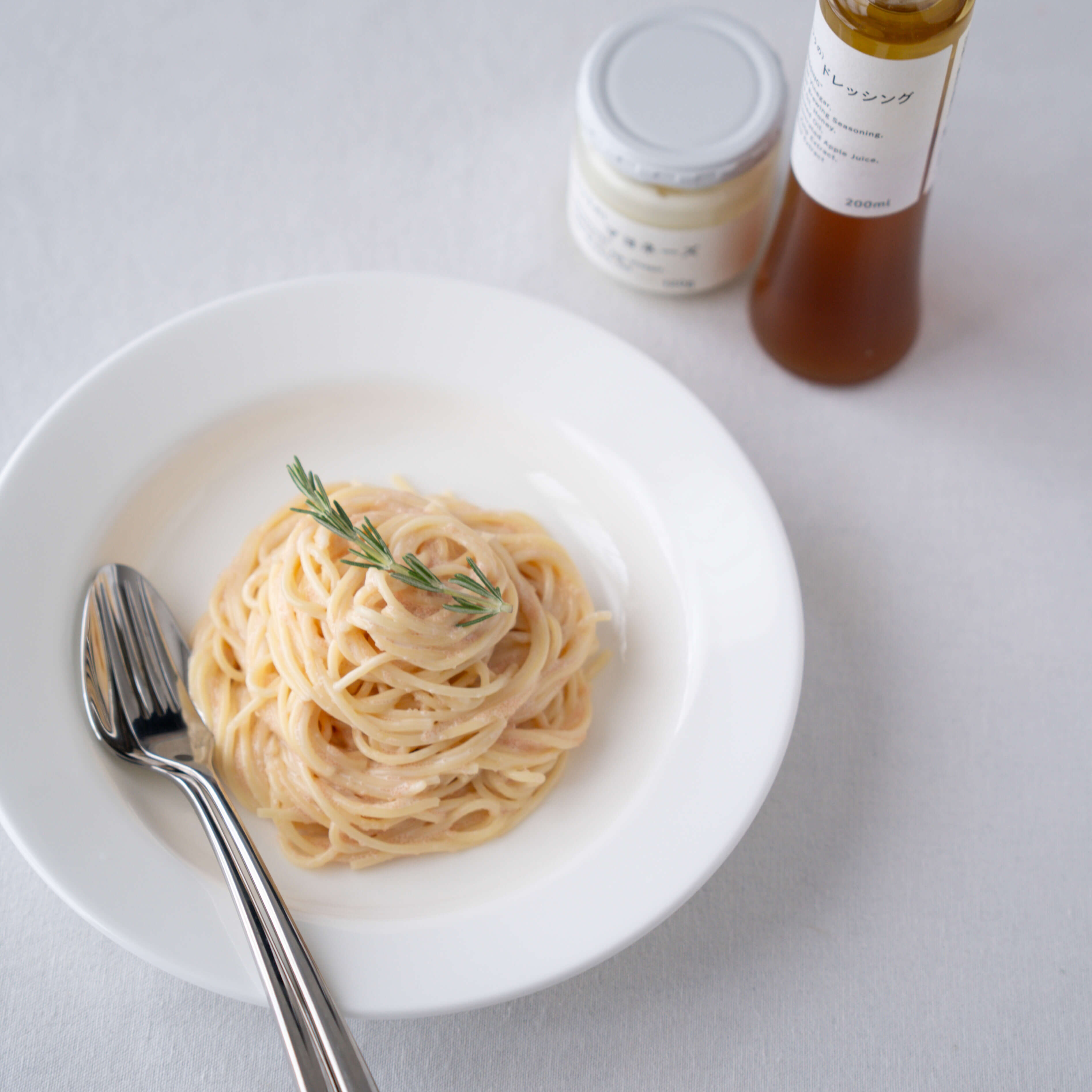 - パスタを茹でる。茹でる際にローズマリーと水に対して0.5%の塩を加える。茹で上がったら(ふつうの)ドレッシングを絡めておく。