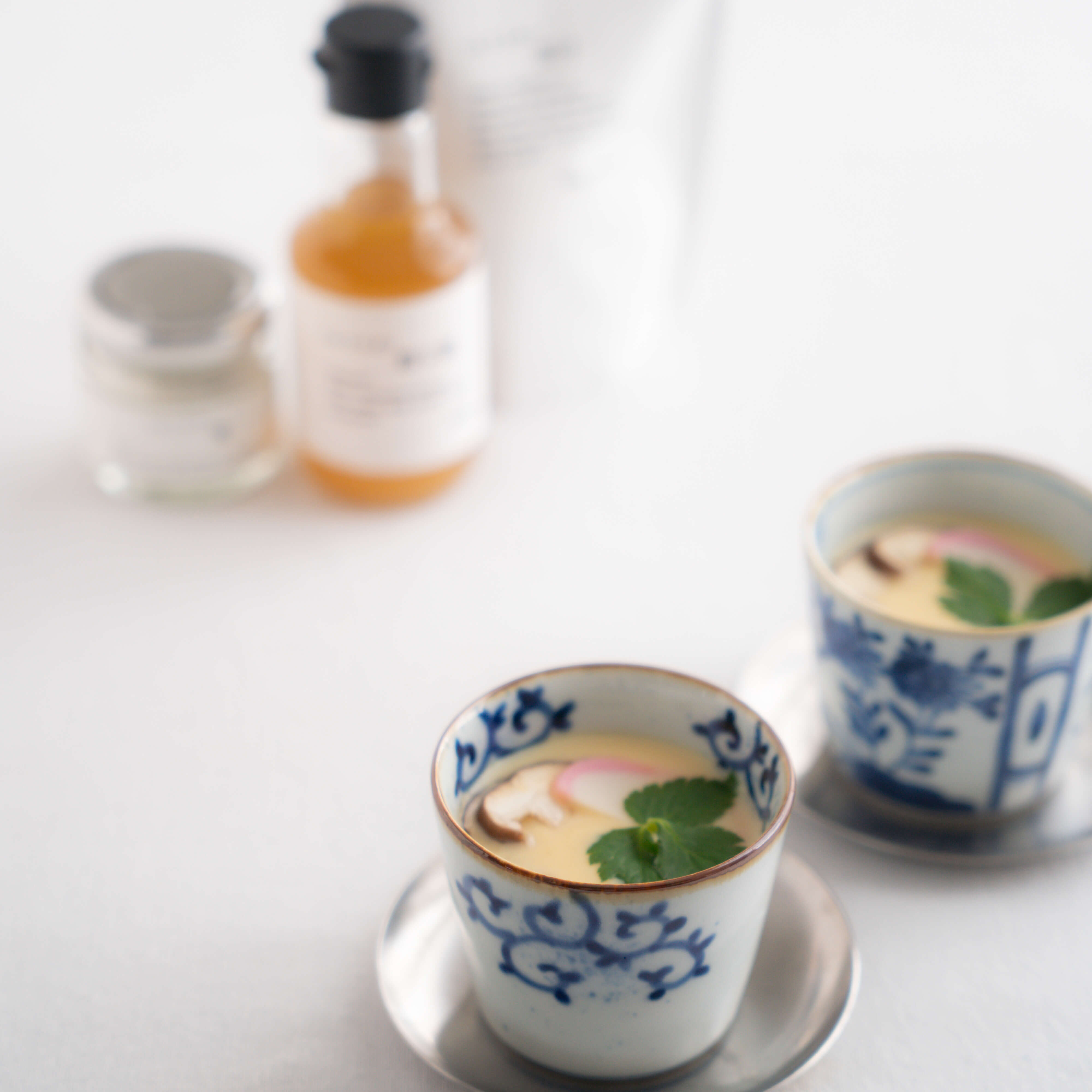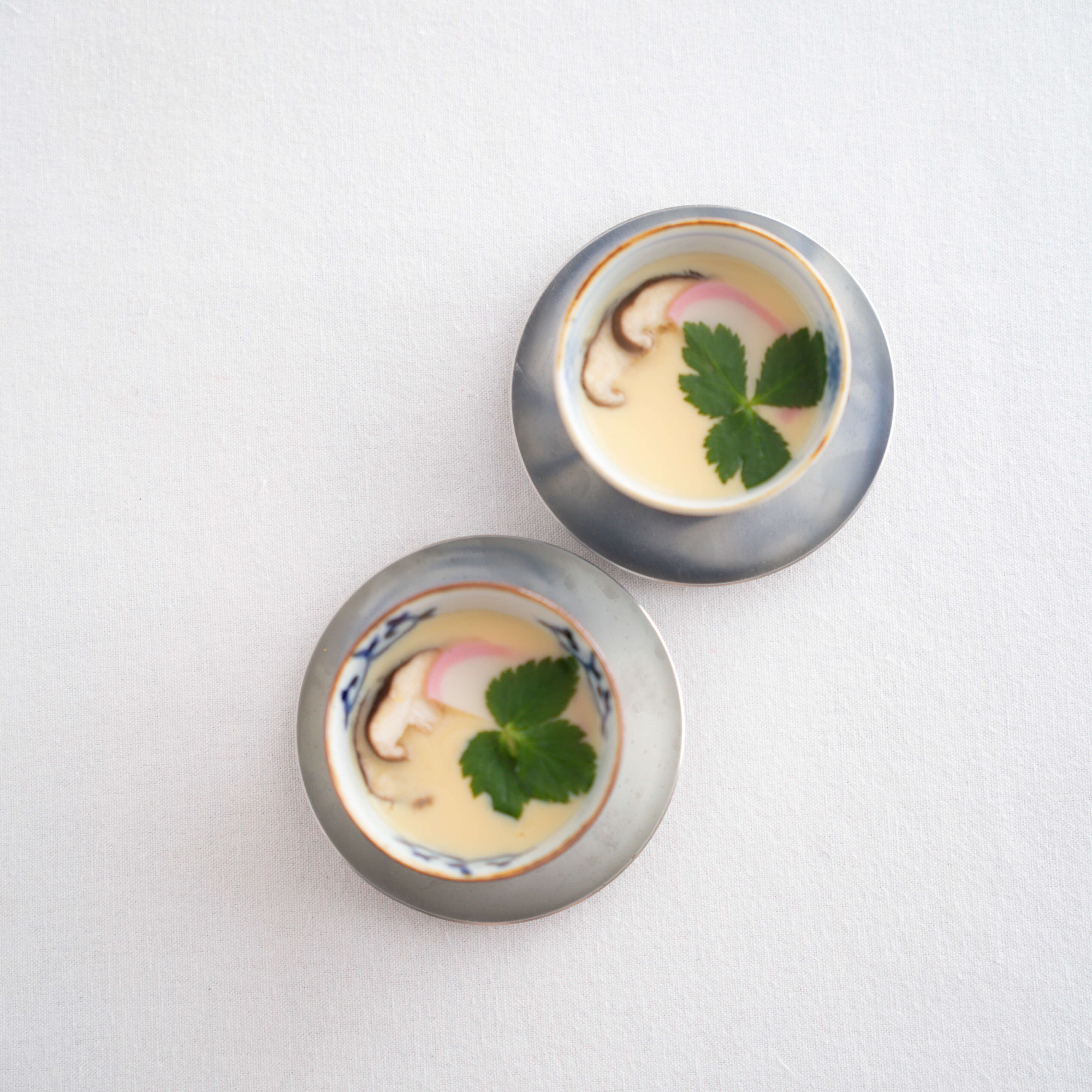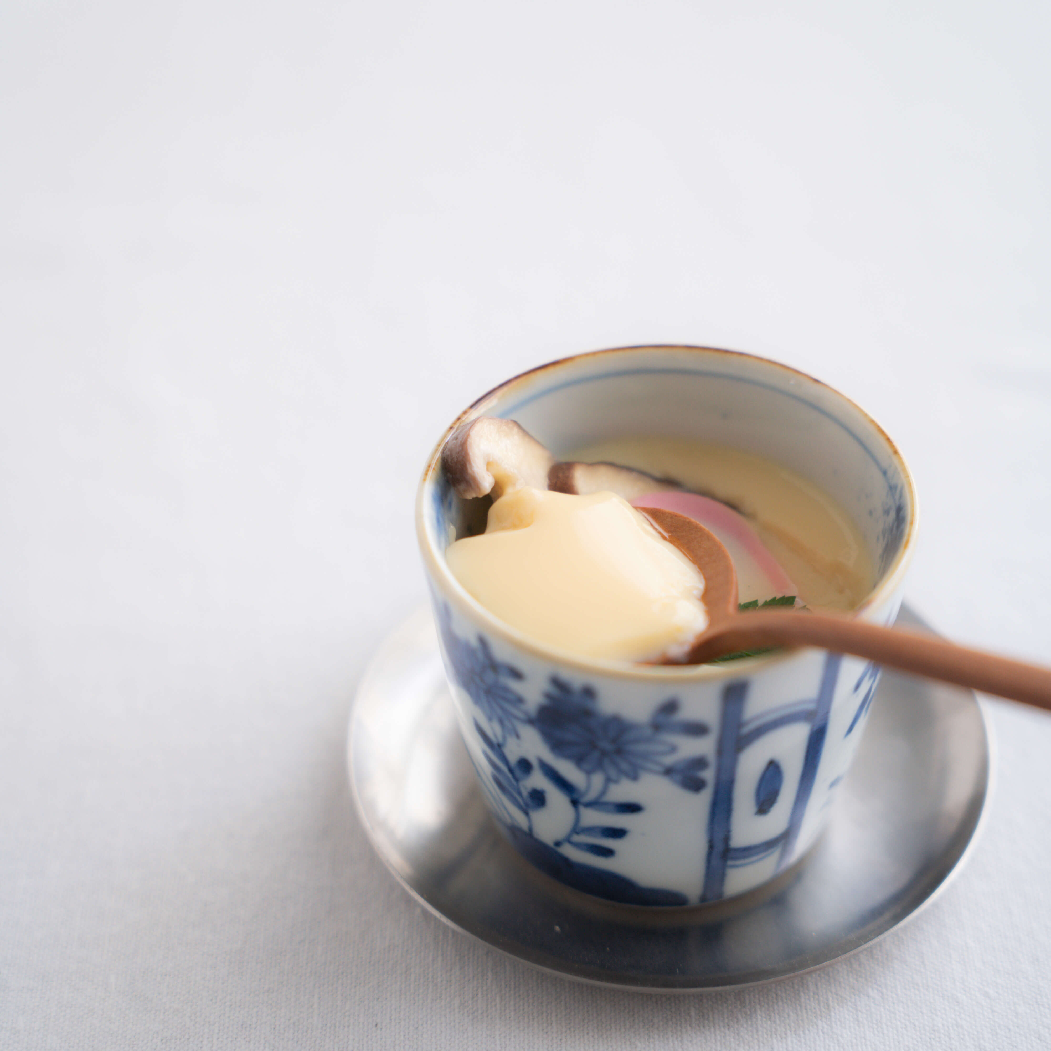 - 耐熱容器に②を濾しながら分け入れ、かまぼこ、椎茸を入れる。アルミホイルで覆い、蒸気の上がった蒸し器に入れ、蓋に菜箸をかませて3分加熱。その後弱火で10分蒸す。仕上げに三つ葉を添えて出来上がり。
