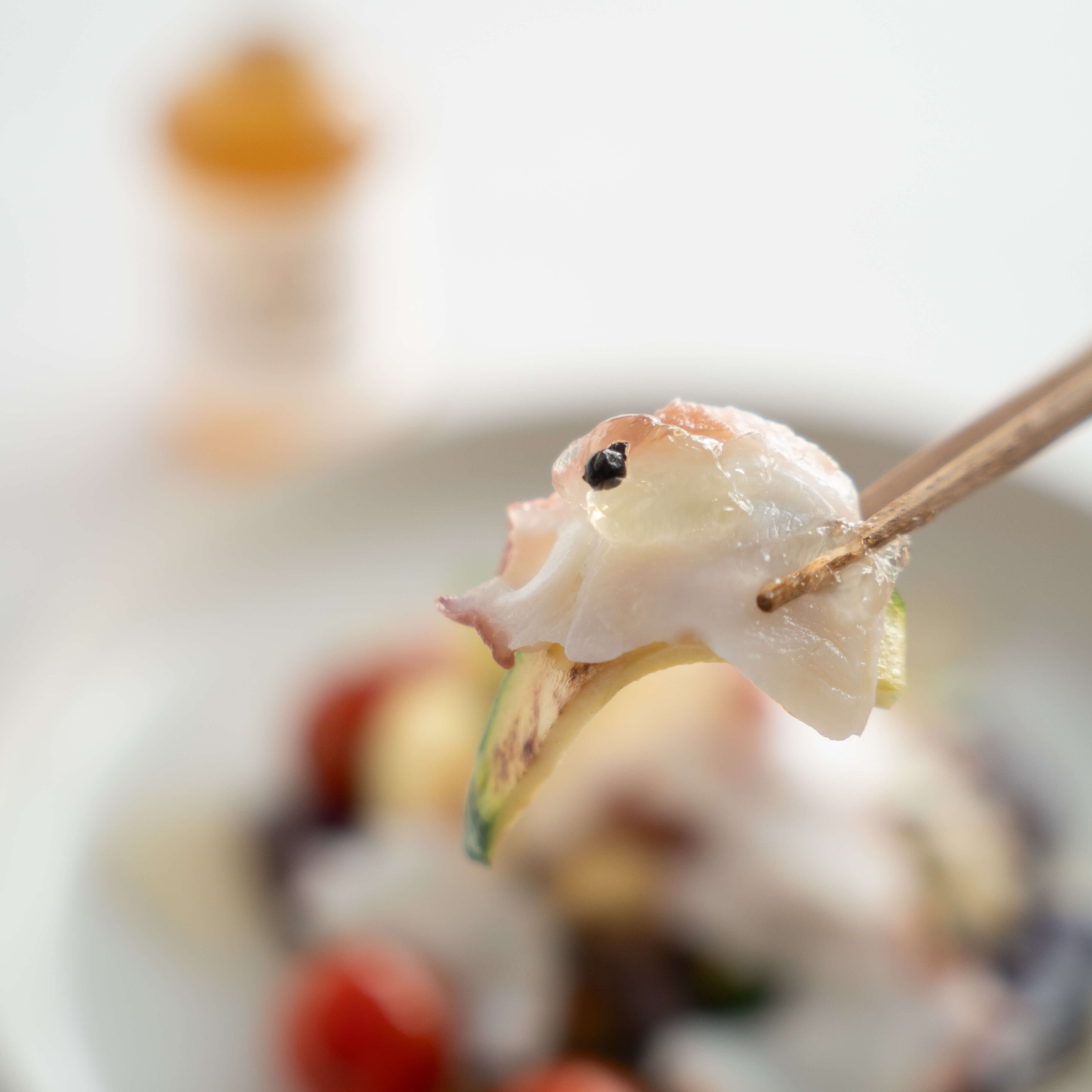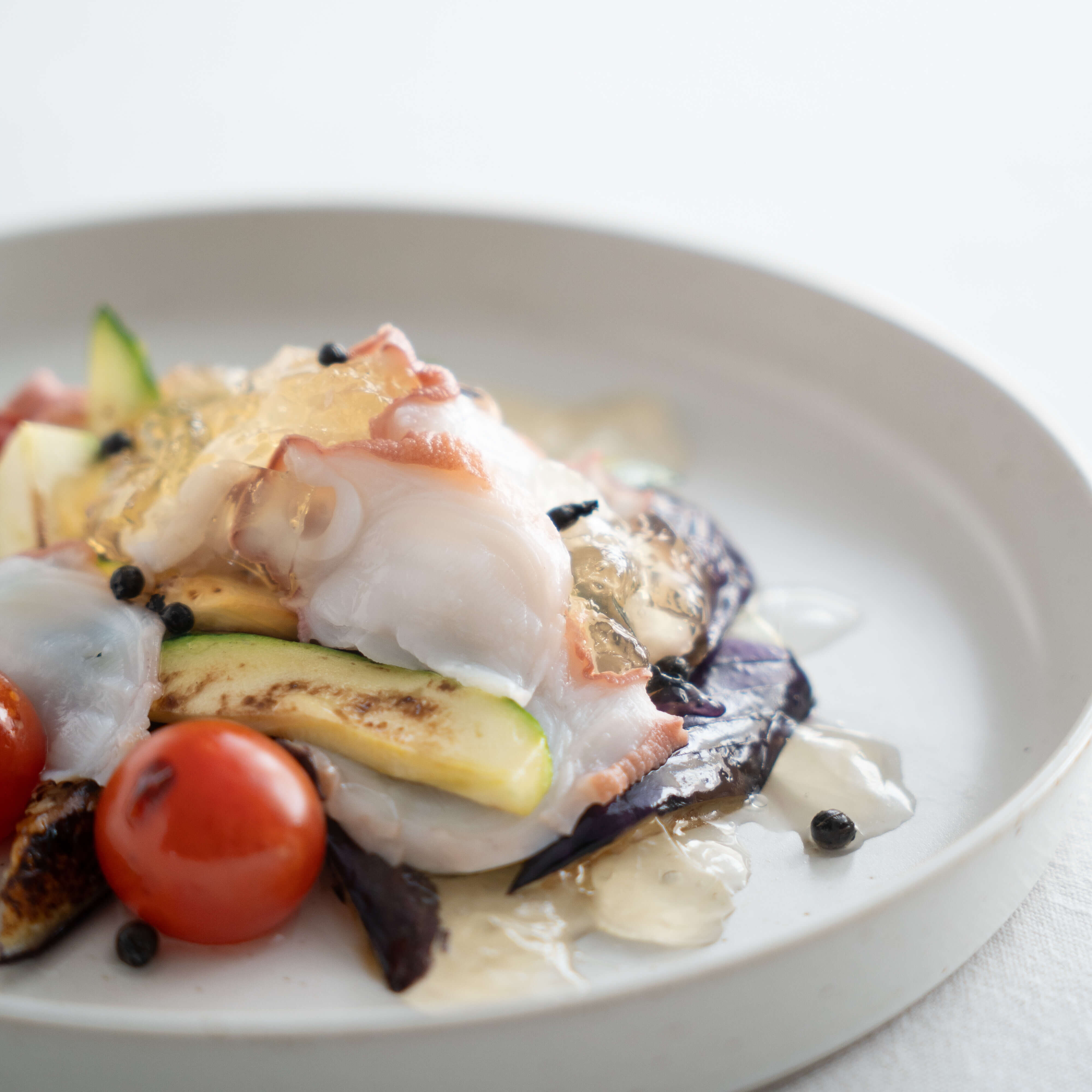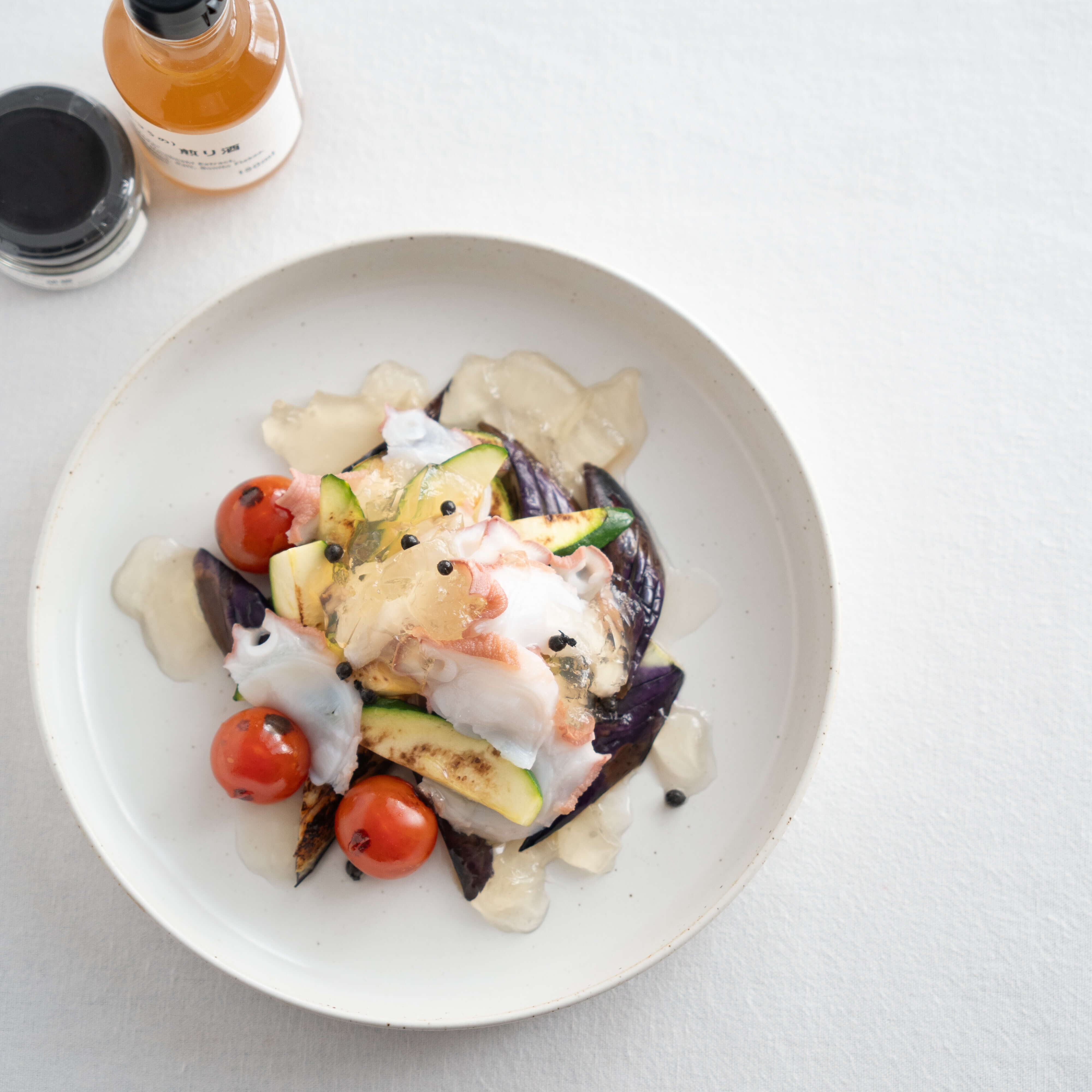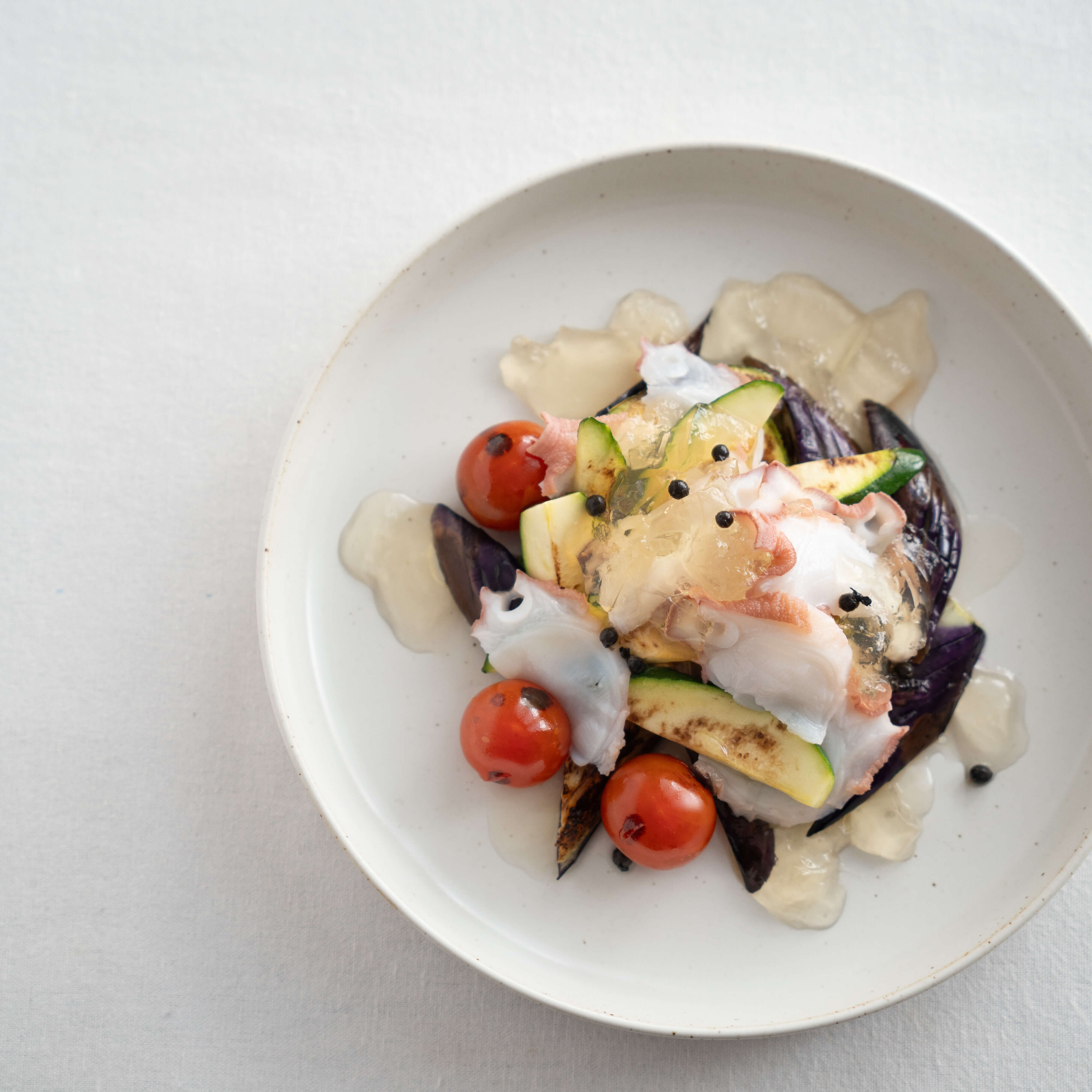 - たこを薄く切り、③の野菜とともに器に盛る。②のジュレをかけ、(ふつうの)胡椒を散らして出来上がり。