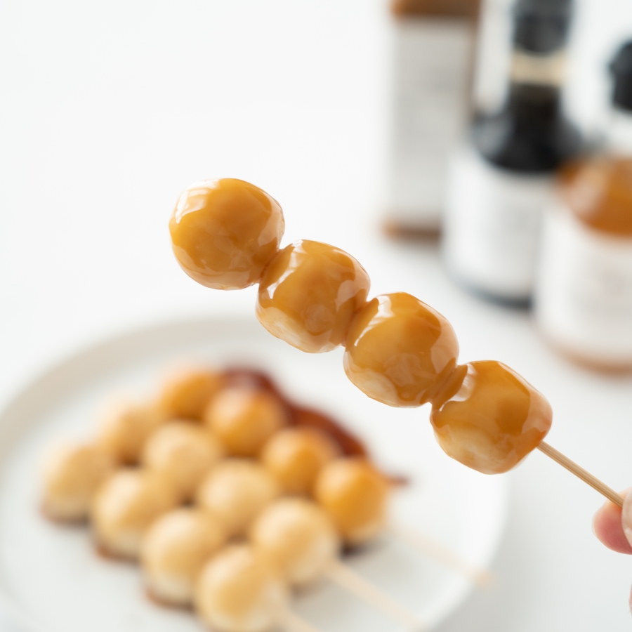 - 串にさした団子に、それぞれのたれをかけていただく。