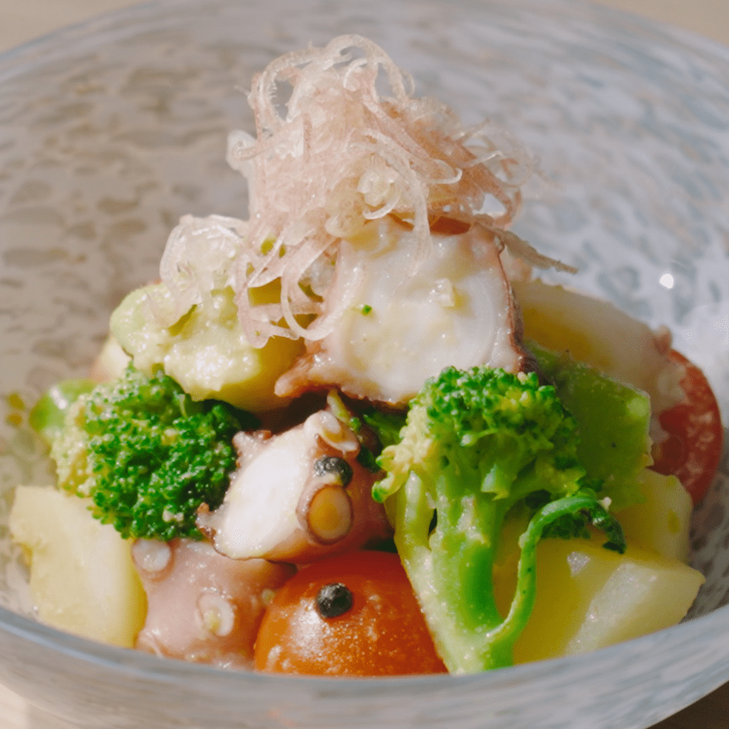 - じゃがいもとブロッコリーを入れたボールに、蛸、アボカド、トマトを入れて軽く混ぜる
