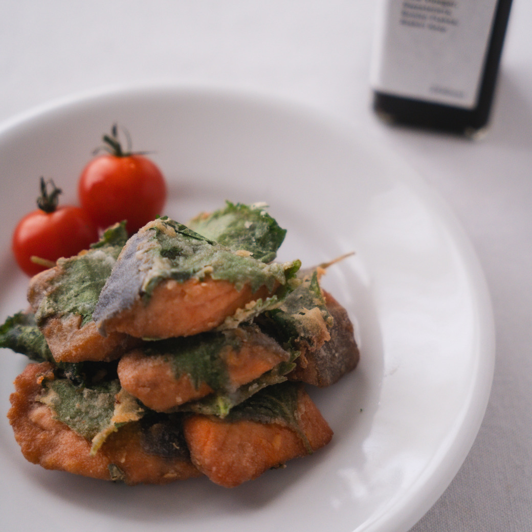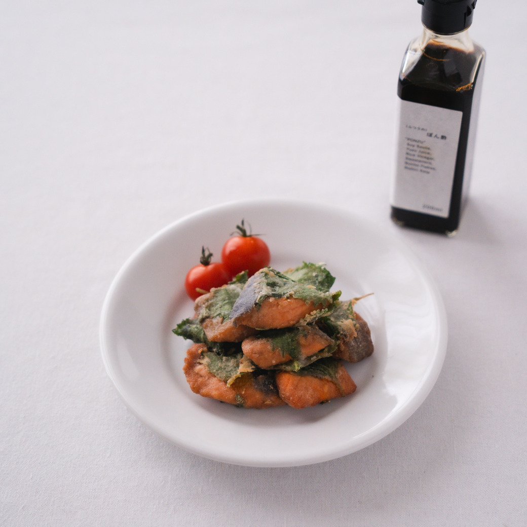 - 大葉で鮭を包み、米粉と片栗粉を合わせたものをまぶして、170℃で3分程度こんがりと揚げる。