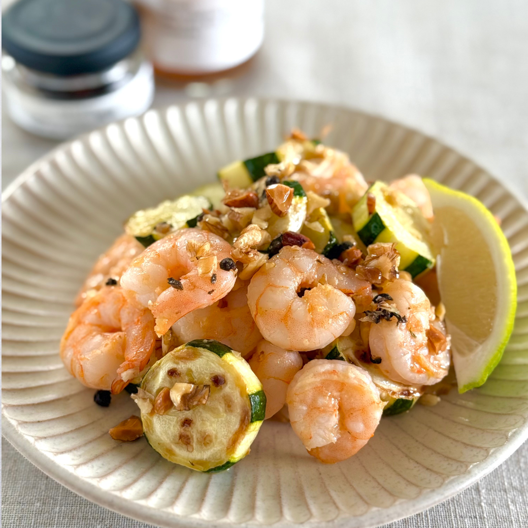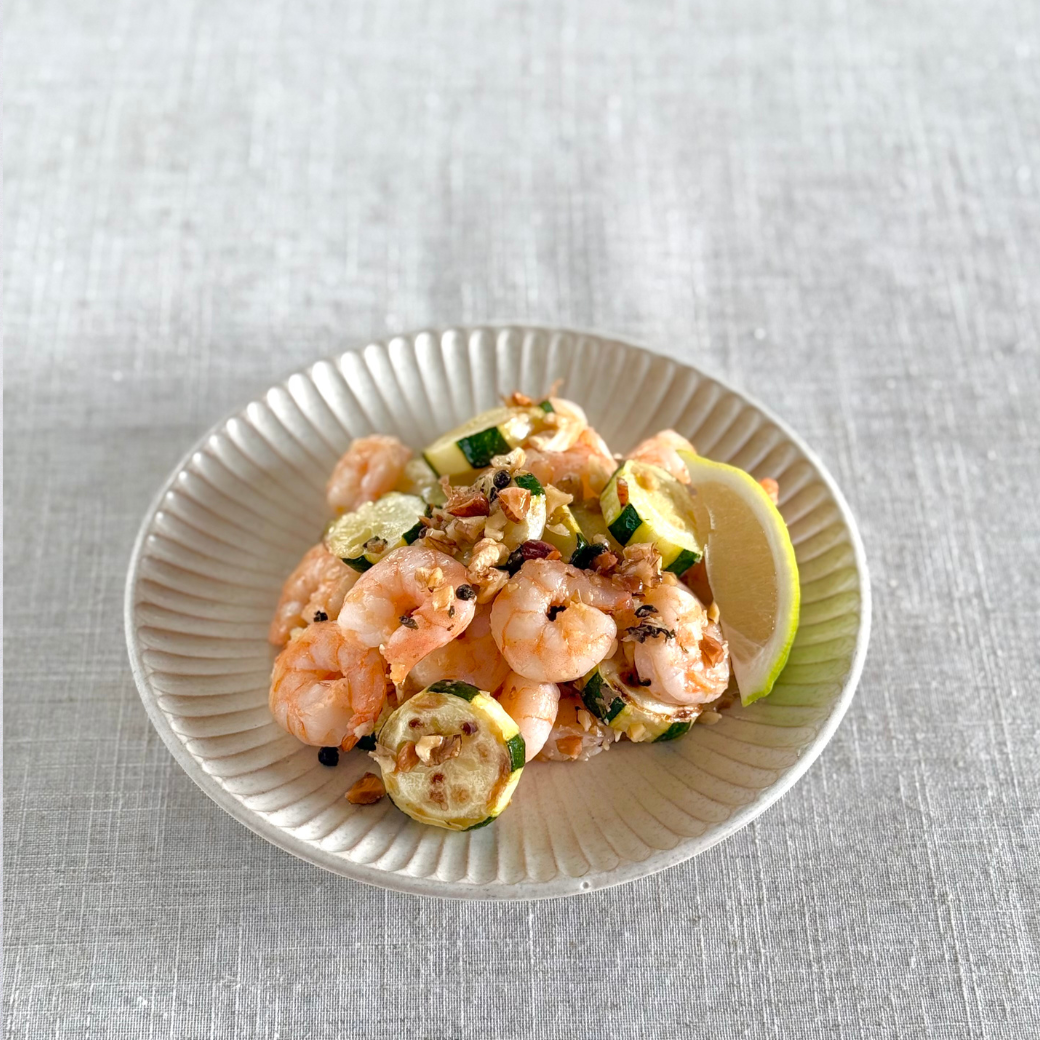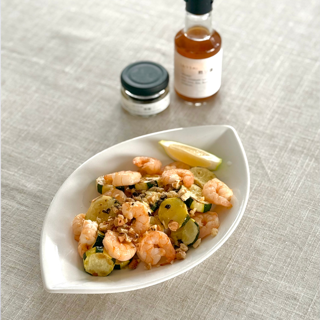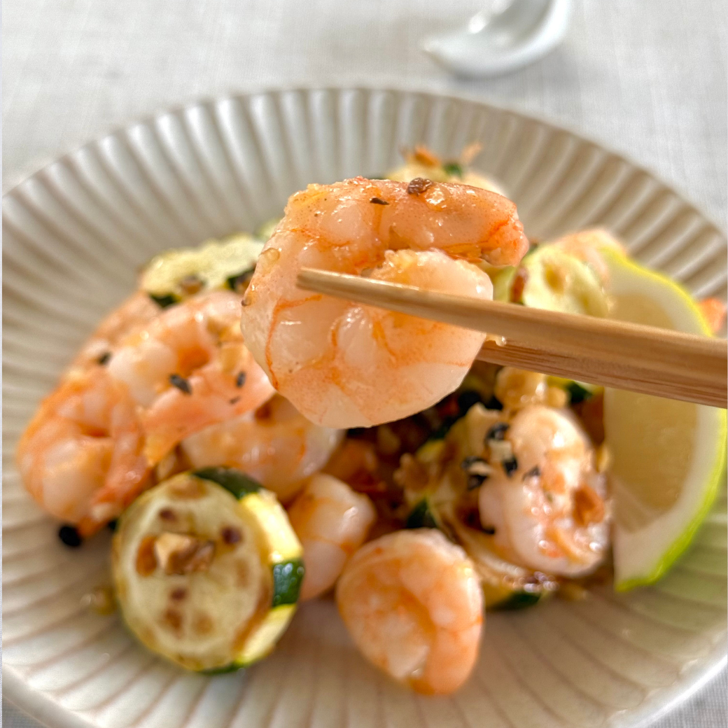 - フライパンにオリーブオイルを入れ、にんにくを弱火で炒める。香りが立ったらズッキーニを加えて中火で焼き、片面が焼けたら裏返し、海老も加える。