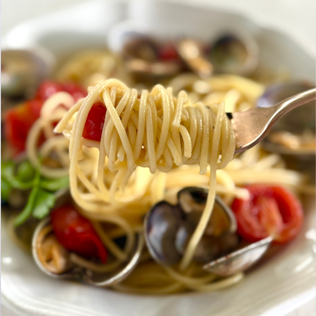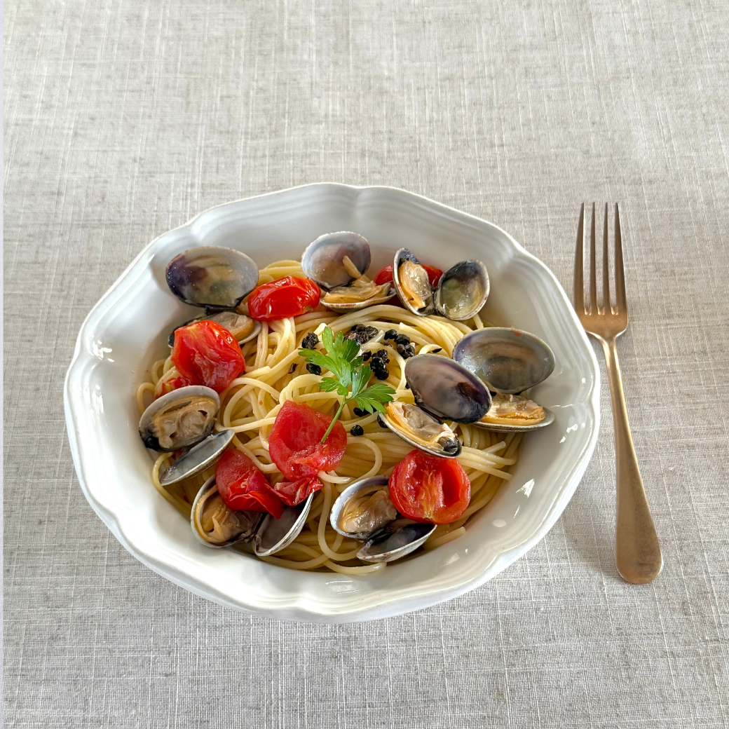 - フライパンにスパゲッティを加え、バターと仕上げ用オリーブオイル適量(分量外)を回しかけて和える。あさりを戻す。