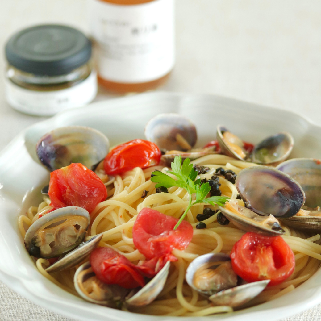 - フライパンにオリーブオイルとにんにくを入れ、弱火で加熱する。にんにくの香りが立ったらミニトマト、あさり、鷹の爪、(ふつうの)煎り酒を加え、蓋をして中火で蒸し煮にする。