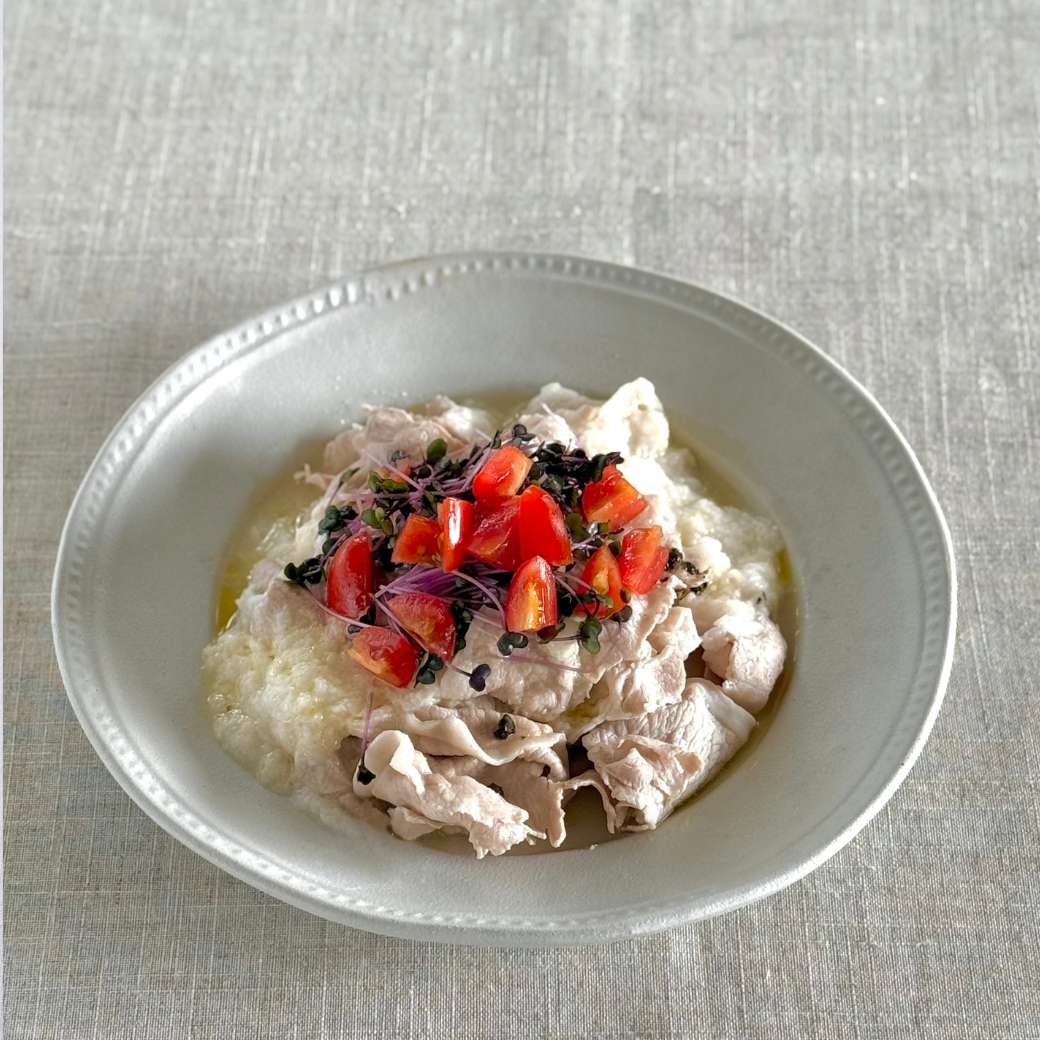 - 器に豚肉を盛り付け、上から長芋をかける。