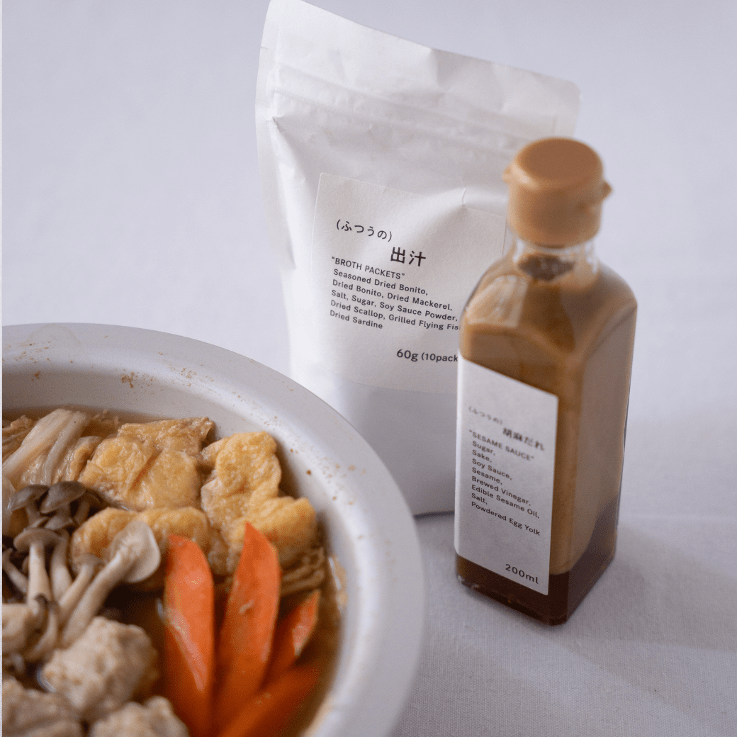 - 鍋に水を入れて沸騰させ、出汁パックを入れて4分煮出す。火を弱め、残りのつゆの材料をすべて加える。