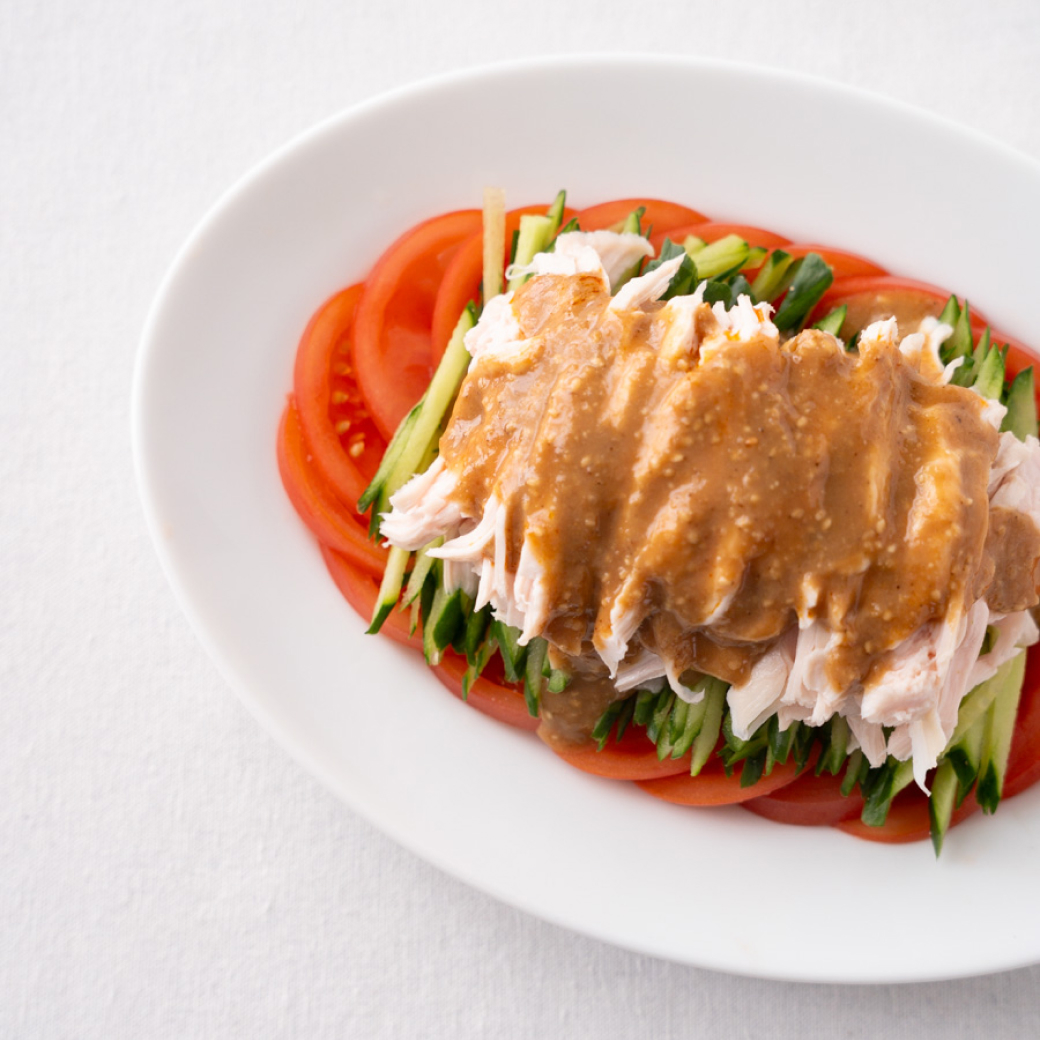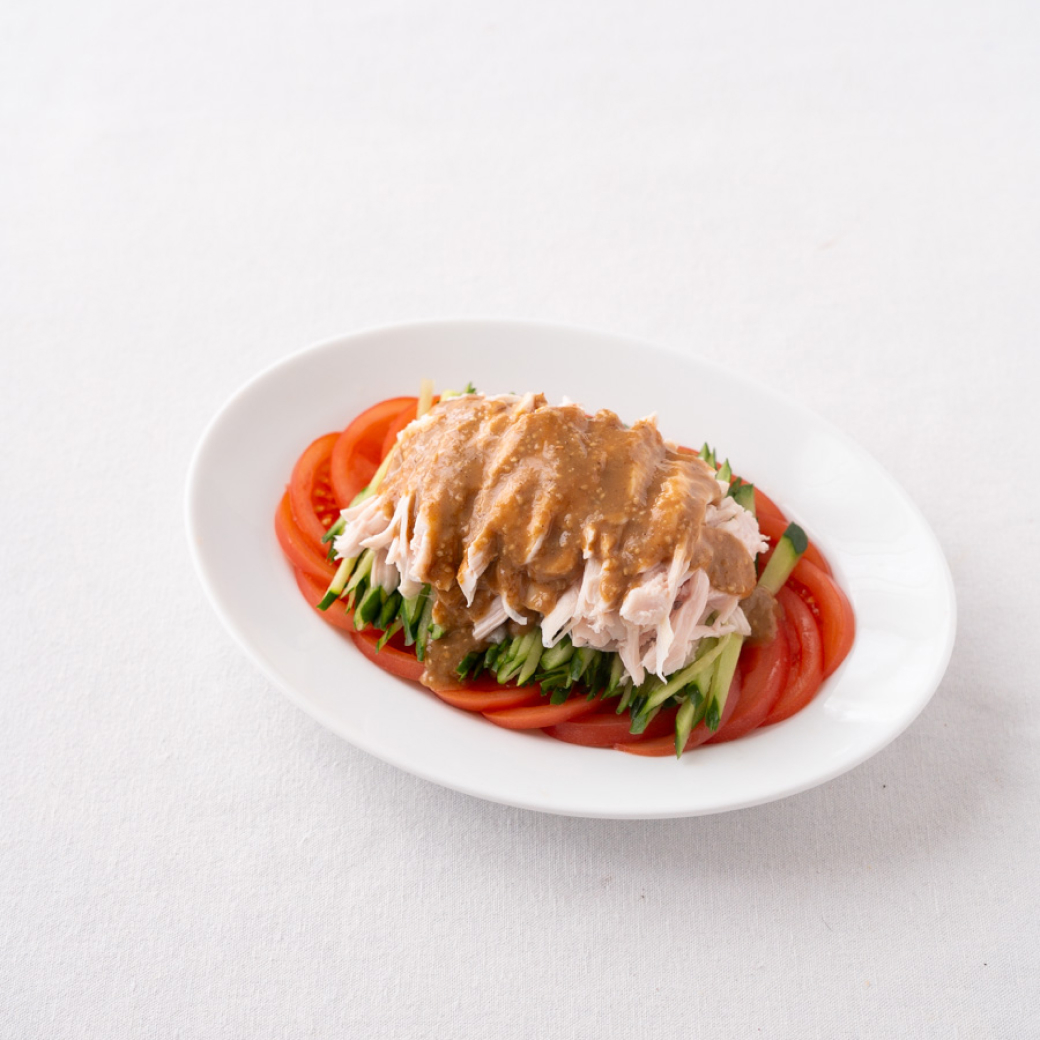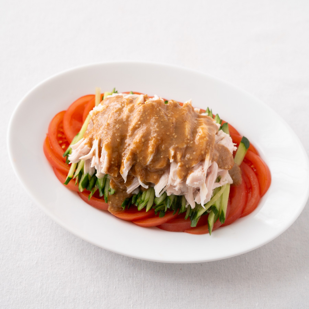 - トマトは薄切りにし、その上に②をのせる。①の鶏肉は繊維に沿って裂きながら盛り付ける。