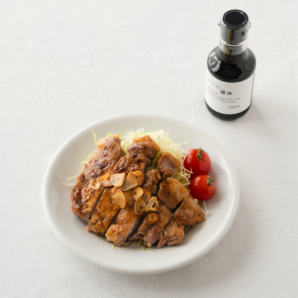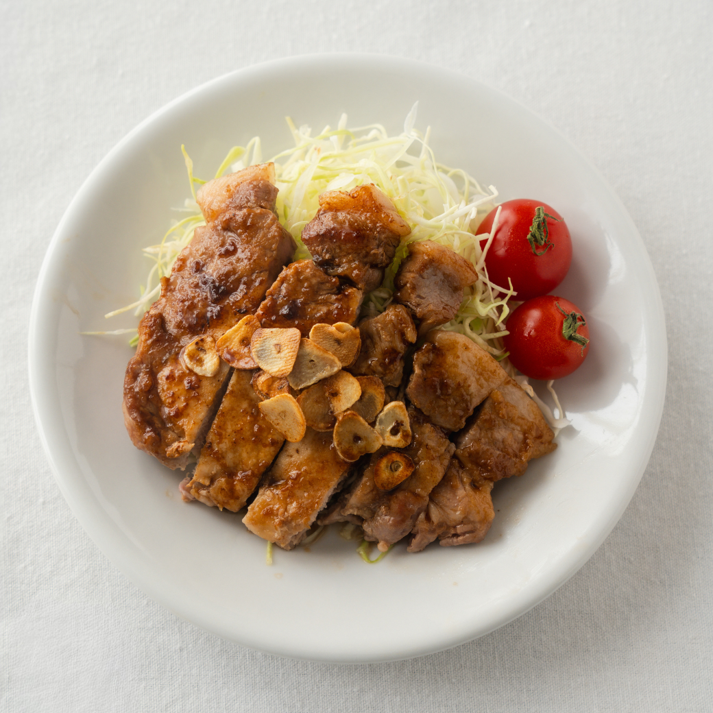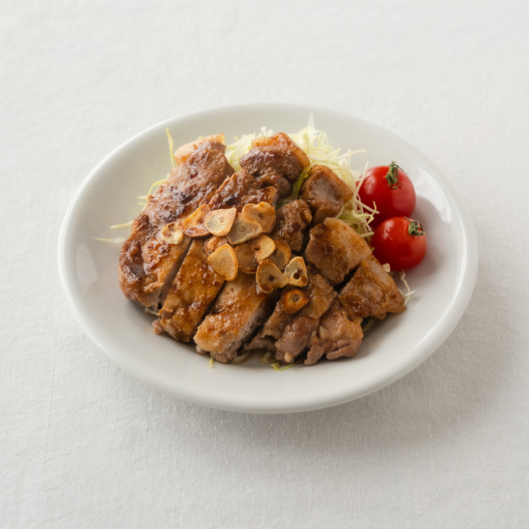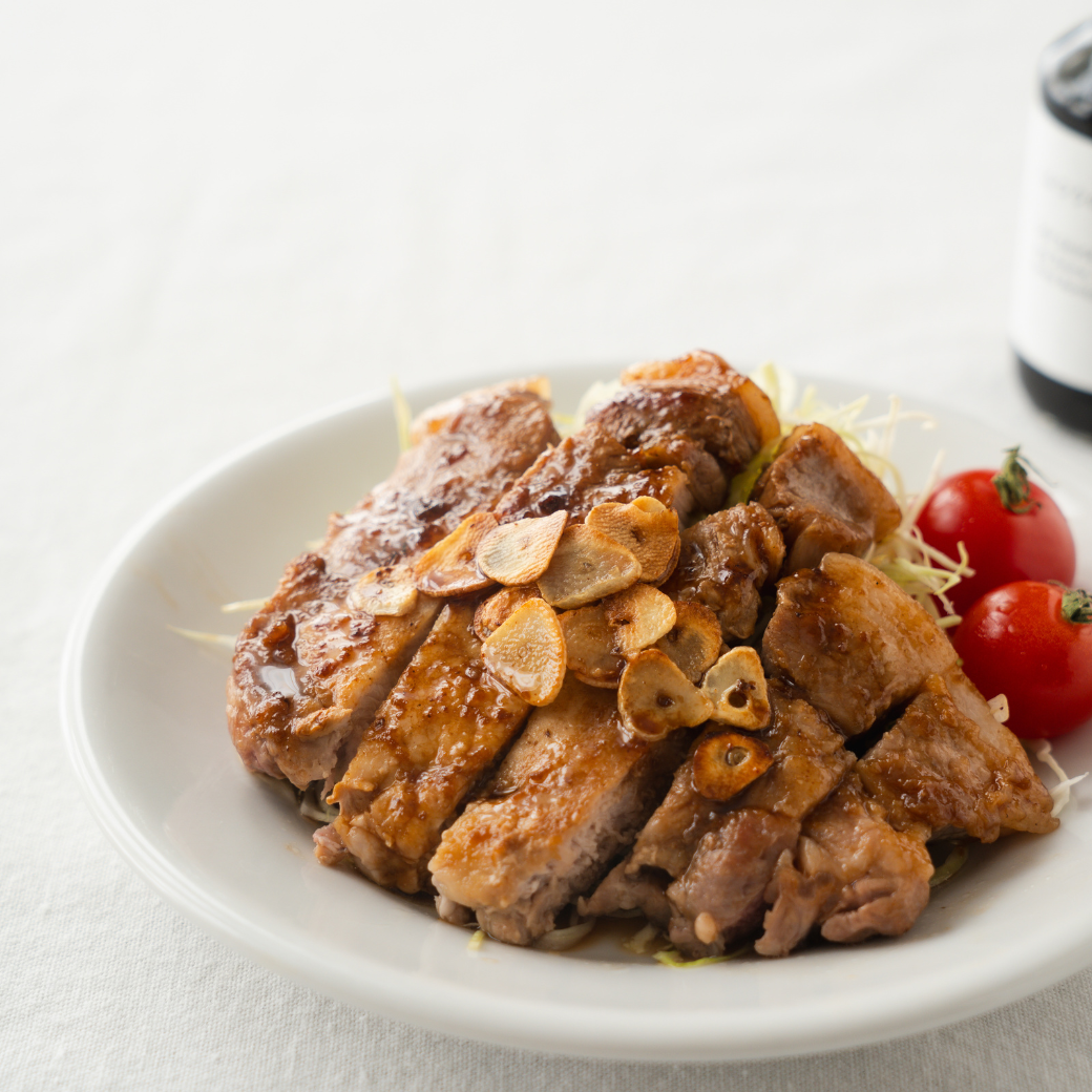 - いったん火を止め、余分な油をキッチンペーパーで拭き取る。<生姜醤油だれ>の半量を加えて弱火にかけ、肉に絡める。火を止めて残りのたれを加えて絡め、器に盛り付ける。にんにくをのせ、フライパンに残ったたれをかけて出来上がり。